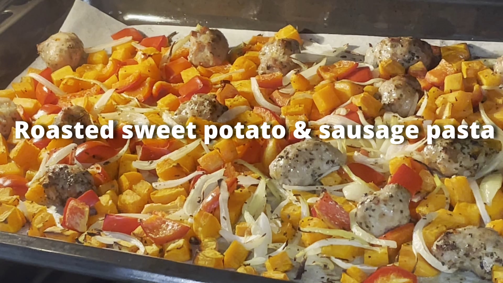 - Add sweet potato cut into bite-sized pieces onto large baking tray