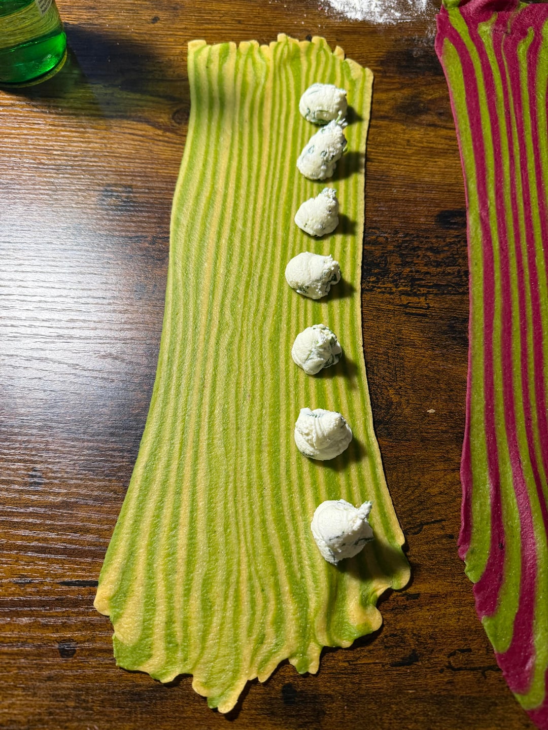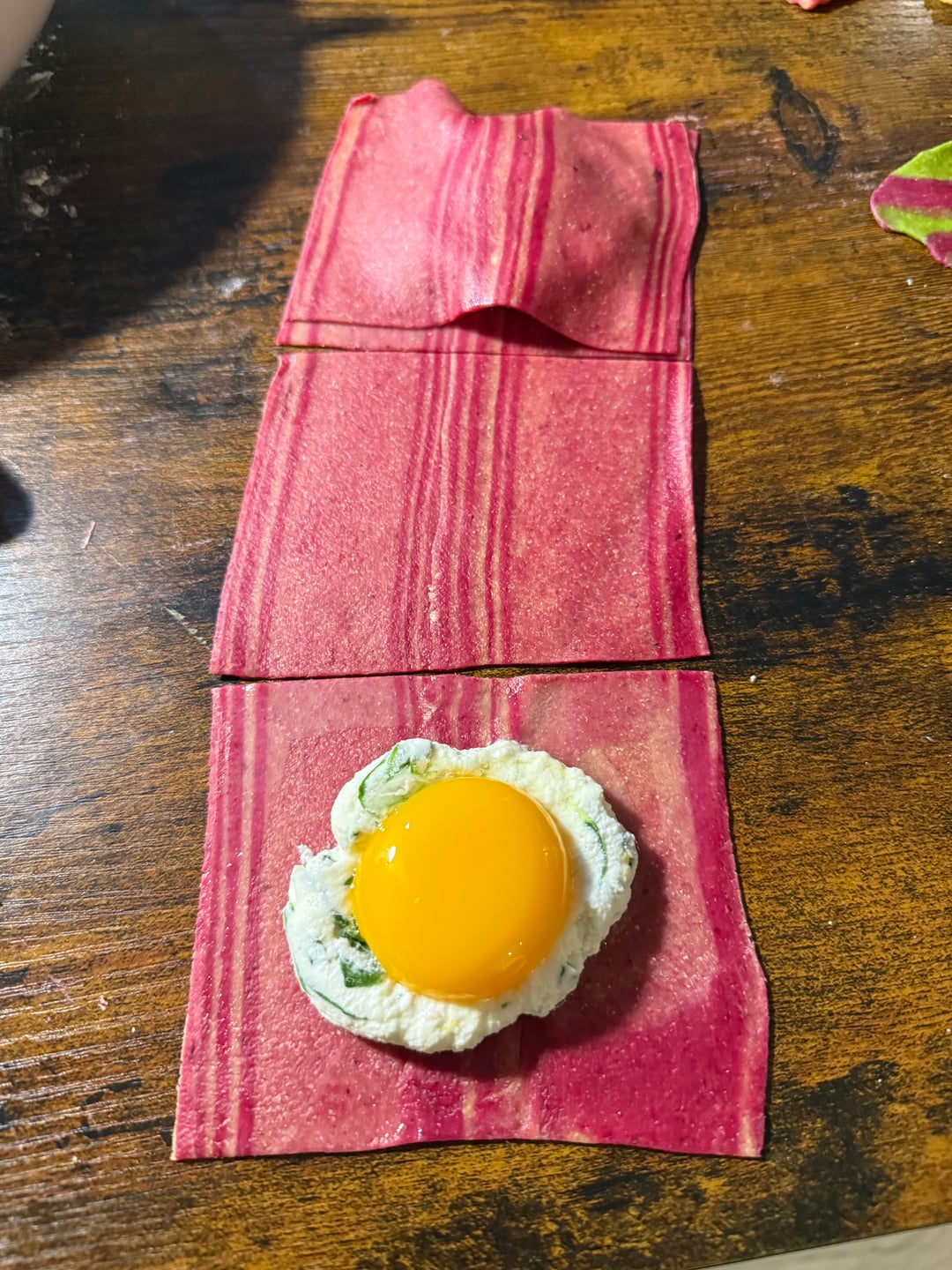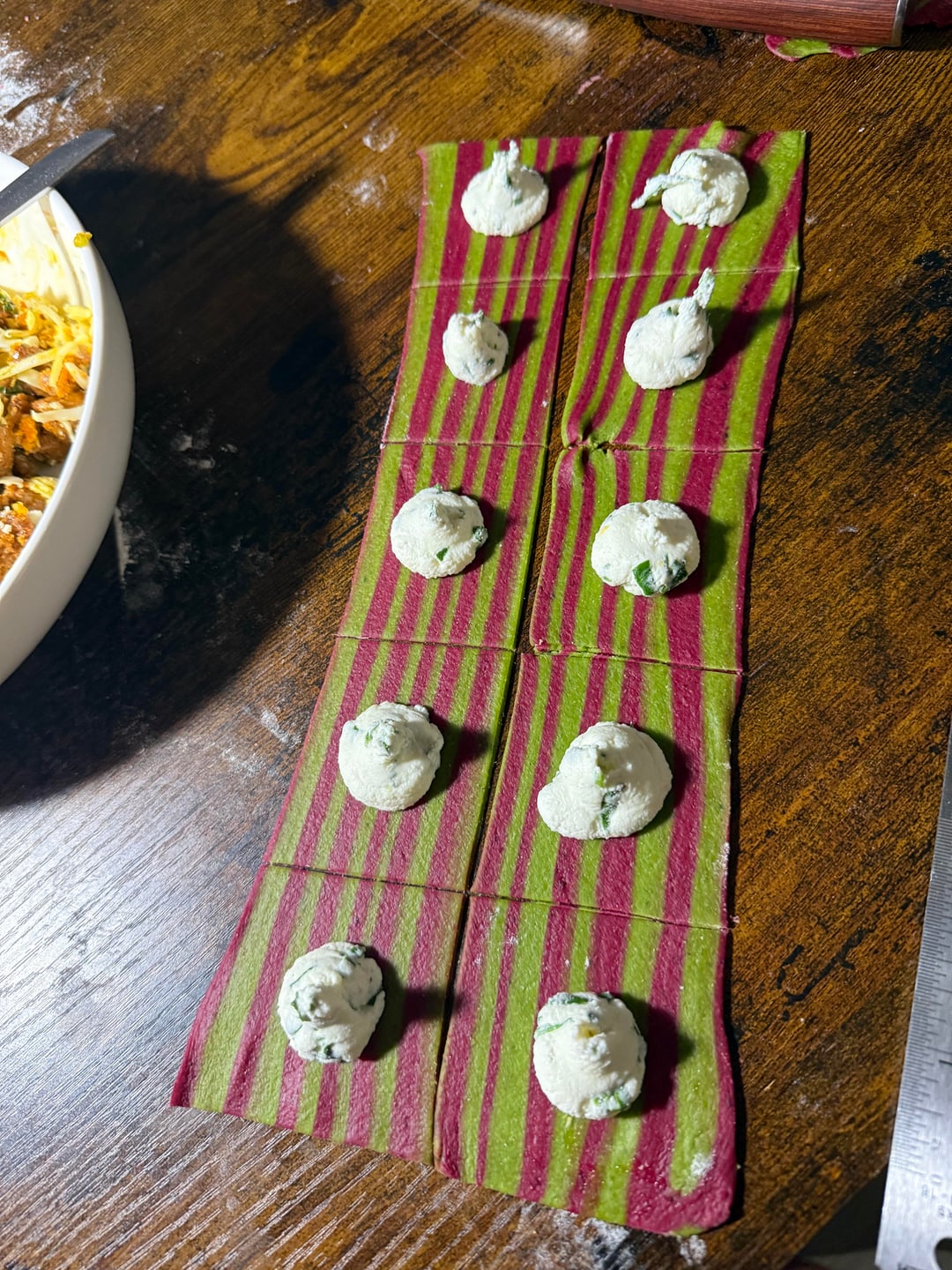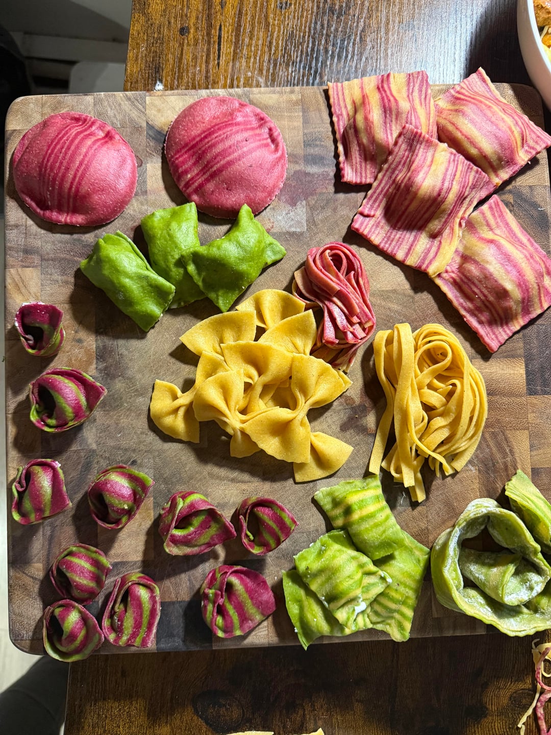 So I spent yet another few days experimenting with fresh pasta doughs, doubling down on spinach and beets, since the colors are so beautiful. I tried my hands at many different shapes, some much better than others… the tortellini look amazing imo lol