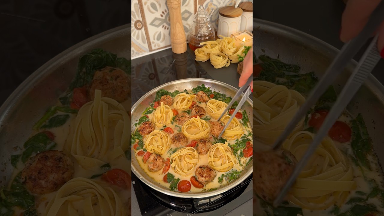 Cook tomatoes, then add garlic. Add spinach, cream, broth, pasta, and meatballs. Cover and cook until pasta is al dente.