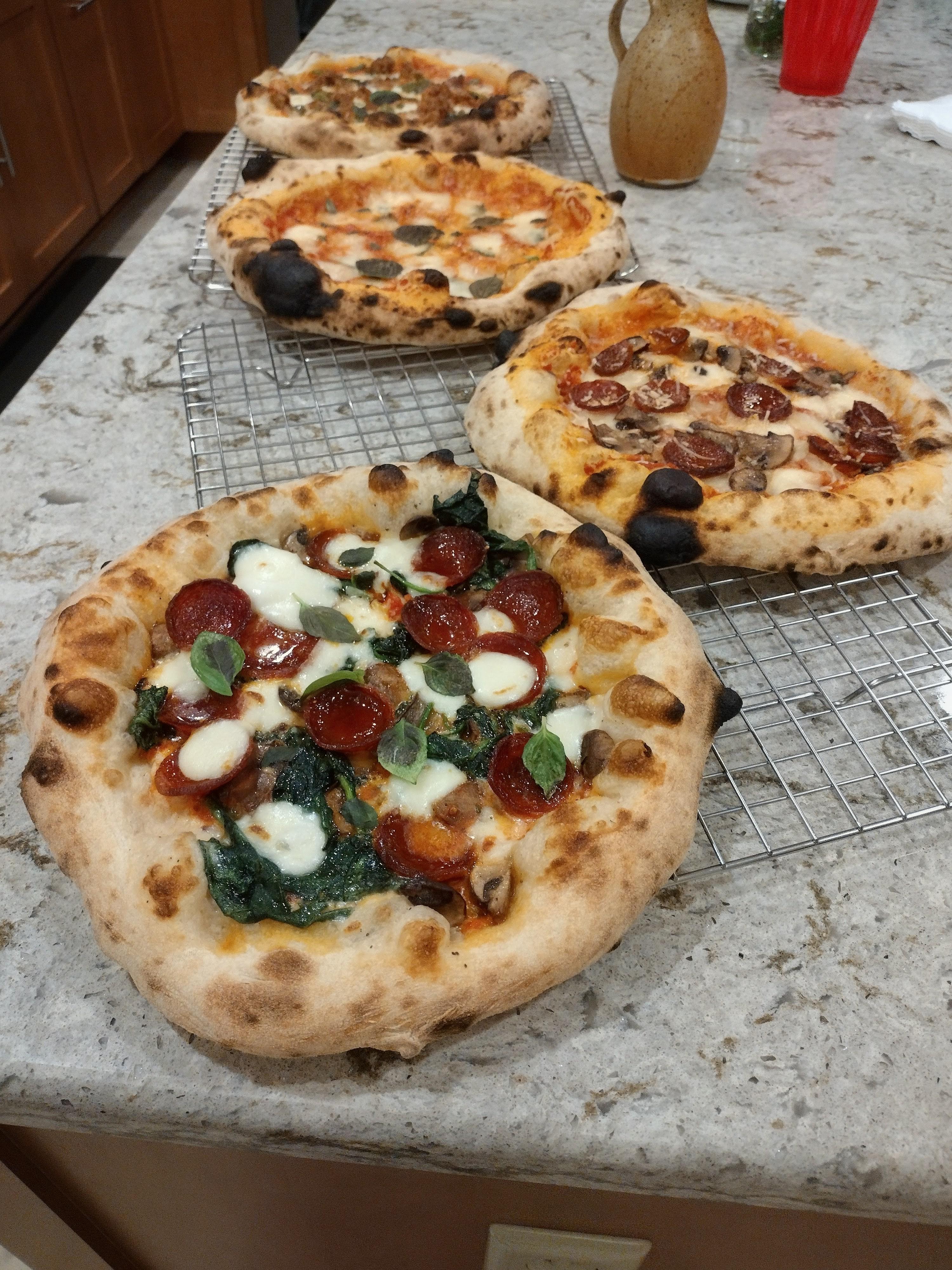 Friday night pizza party, made 12 pizzas. This is the first time that I used Caputo 00 flour. I like it, it's easy to work with and doesn't char/burn so quickly like King Arthur 00 does in the heat of my brick pizza oven.