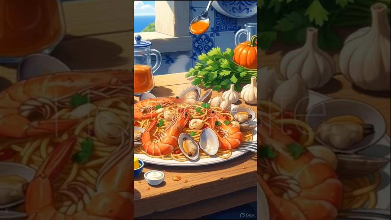 Fresh shrimp, clams, garlic butter, and silky cream come together to create a rich pasta dish that feels like dining by the ocean. This relaxing cooking video brings anime-inspired comfort food to life with cinematic kitchen visuals.