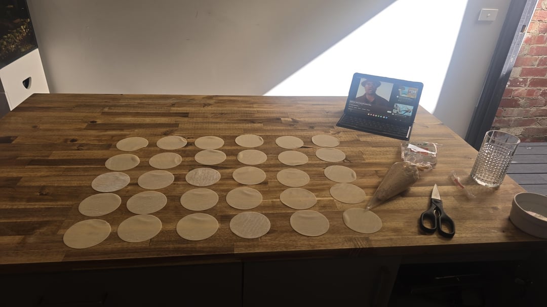 Made by blending the shreded chicken from the coup chicken, only thighs, legs and wings. Then added an egg to the blenderwith basic spices, paprika salt peper and a little bit of parsley, and piped out the chicken “mousse” into the wrappers.