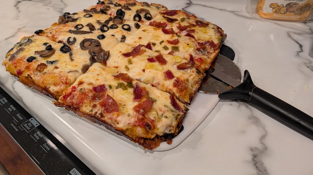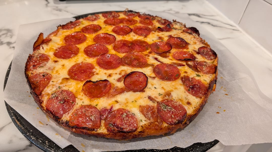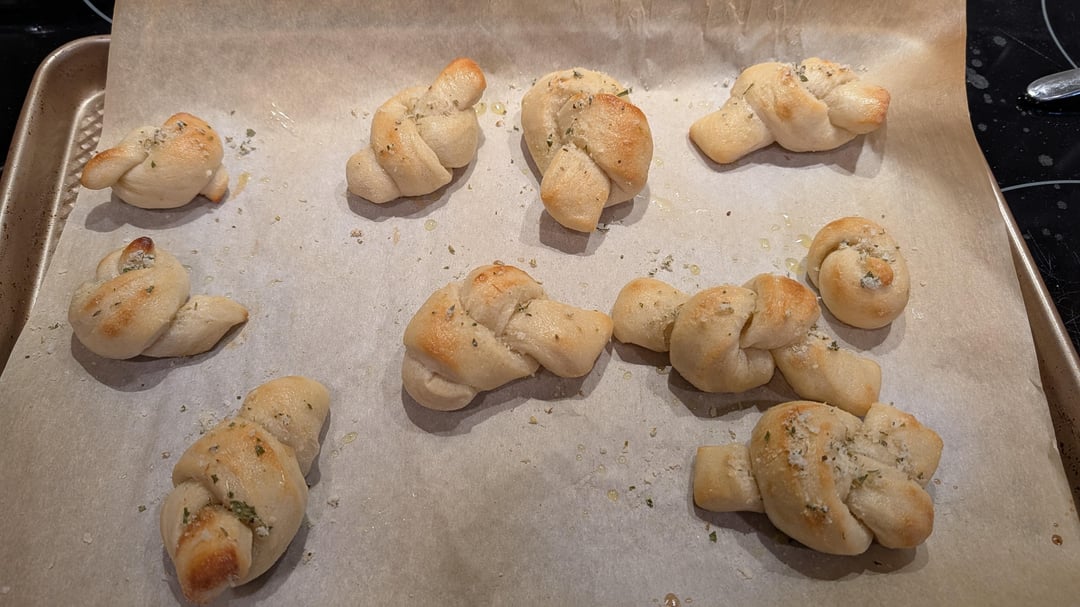 Followed the pizza bible recipe for Detroit style dough but made more of a pan pizza. Topped it with some garlic oil and a seasoning blend I made like a copy cat pizza hut blend they put on their bread sticks. Had some left over dough so tried making some knots and they turned out pretty good. Love my Lloyd pans and baking steel!