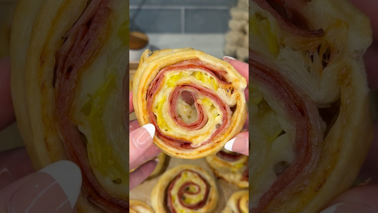 Roll out the puff pastry dough and evenly spread mayonnaise over the surface. Then add a layer of ham, pepperoni, salami, cheese, and banana peppers. Roll tightly into a log (allow to set in freezer for 10-15 minutes if needed to firm up) and slice into 6-8 pinwheels. Place pinwheels on a parchment-lined baking sheet. Brush the tops with beaten egg, then bake at 400°F for 18-20 minutes until golden and flaky. Don’t forget the cheese pull and enjoy! 😋