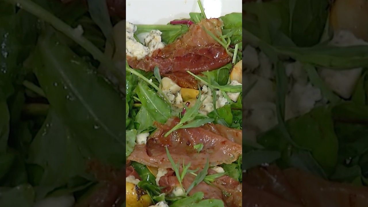 4. Листья салата выложить в миску, полить половиной заправки, сверху разложить груши, голубой сыр и ветчину, посыпать все листьями тархуна и полить оставшейся заправкой.