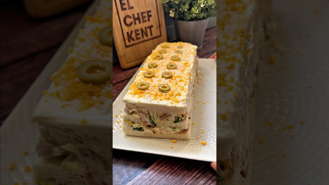 INGREDIENTES : 🔸7 rebanadas de pan de molde sin corteza 🔸2 contramuslos de pollo asado 🔸3 huevos cocidos ( reserva una yema para decorar 🔸8 lonchas de bacon troceado 🔸Lechuga 🔸Mayonesa 🔸Queso rayado(el que más te guste) 🔸Aceitunas