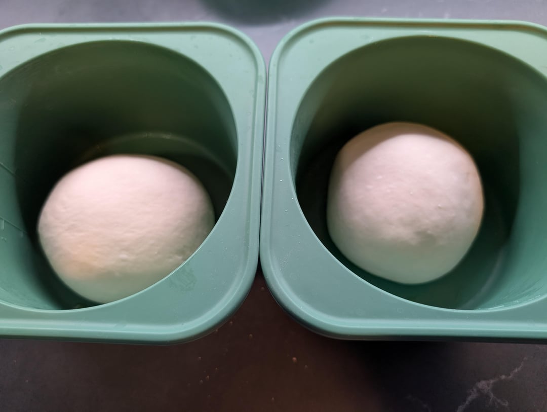 Divide in 300g balls, place in oiled individual silicone bowls, and in the fridge it goes.