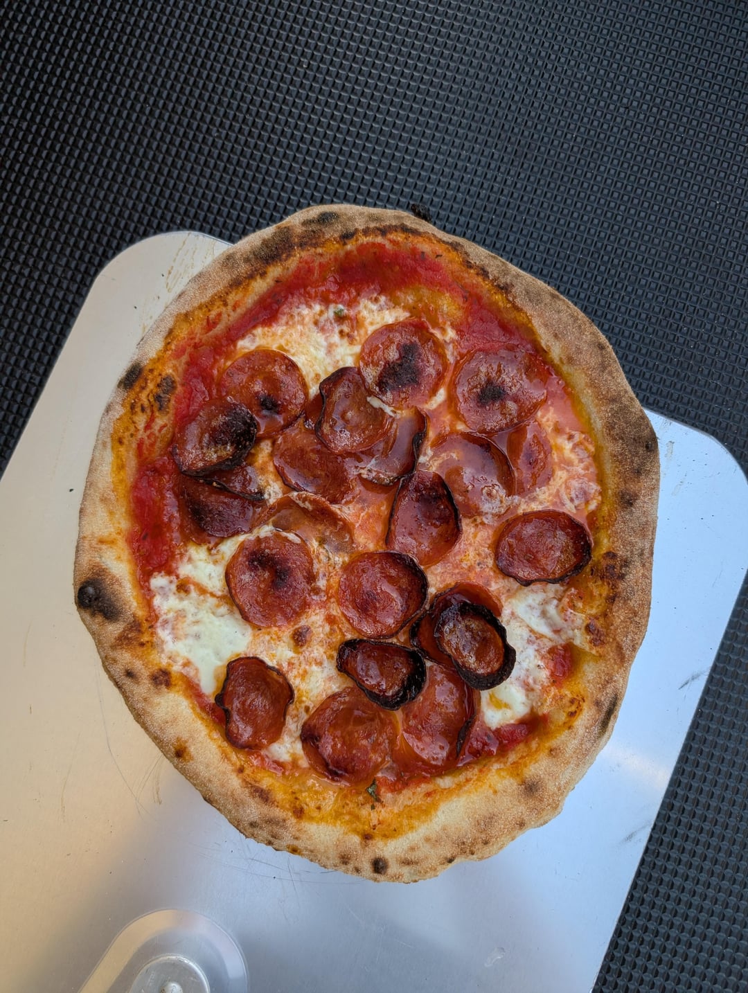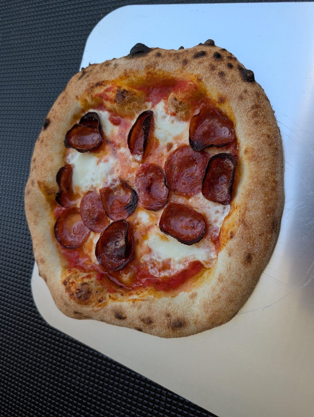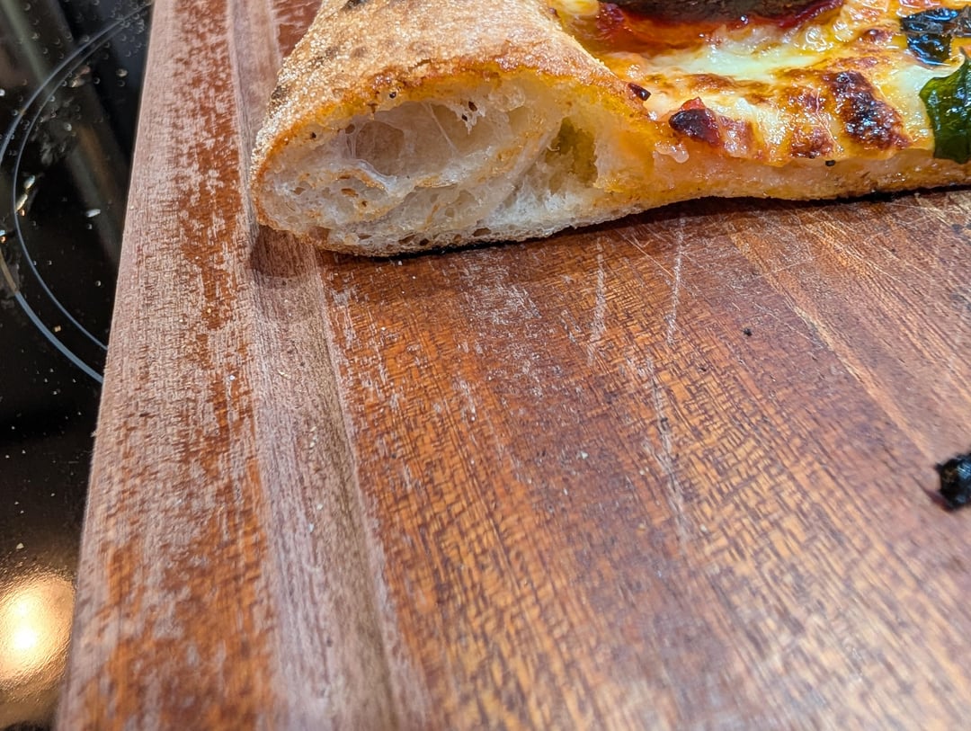 300g dough ball is on purpose to allow a very large rim because I WANT a "life raft" cornichone. I left a full 1" rim I didn't touch when I spread out the dough. The dough worked effortlessly! No issues, no shrink back. Using the rice flour and a wood peel is like butter! I did 5 dough balls, I can confirm that balls 4 & 5 were starting to approach overproofed. Came out very sticky and were a little difficult to shape but the rice flour made things easy. I will pull balls 4 & 5 15 minutes later than the first group.