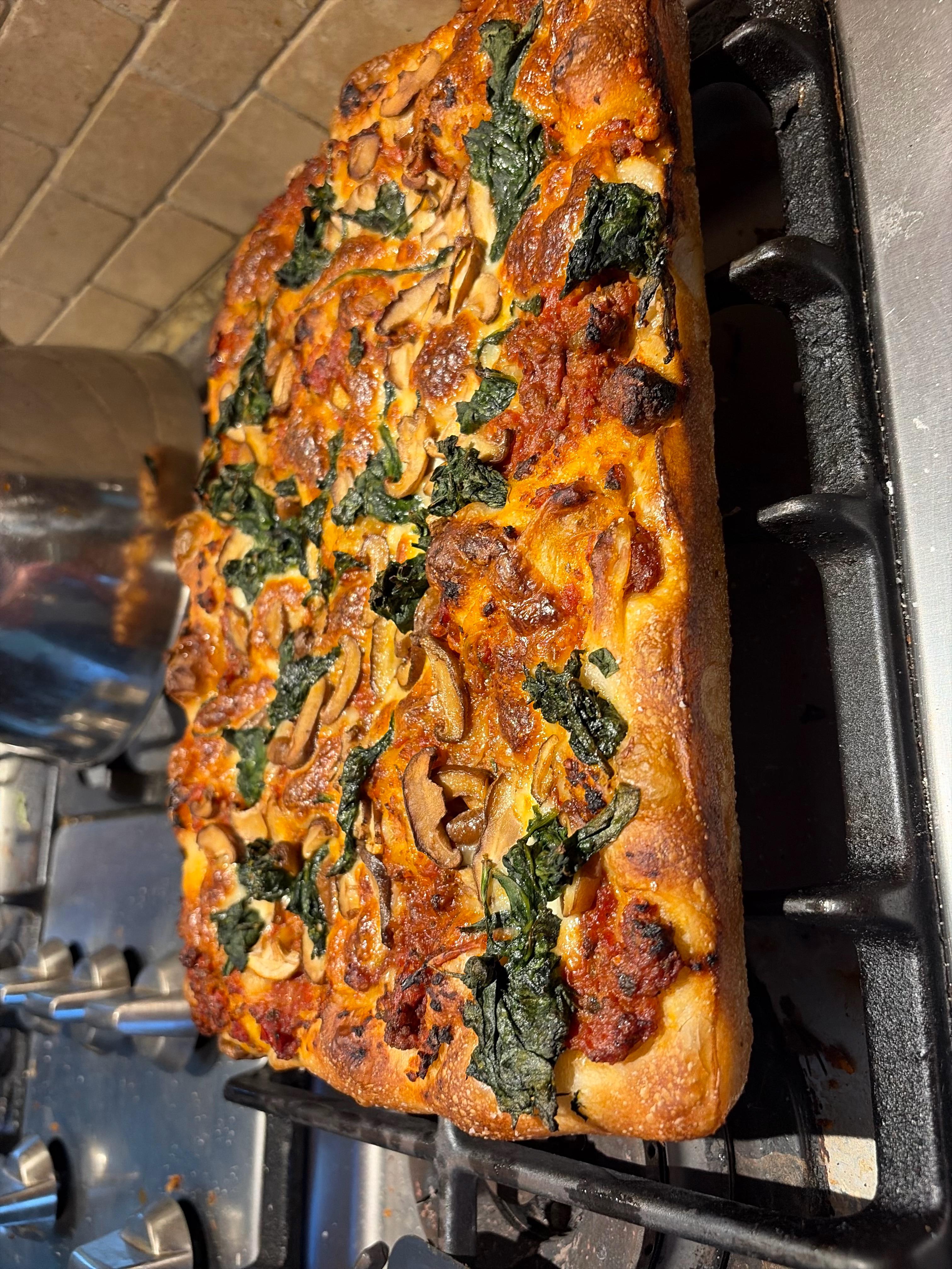 Homemade sourdough (started 2024 – thanks Beryl for killing my 2020 starter) with local Houston beef and herb tomato sauce (herbs are from my porch garden) simmered for 3 hours. Shitaki mushrooms, spinach, and Kirkland mozzarella.