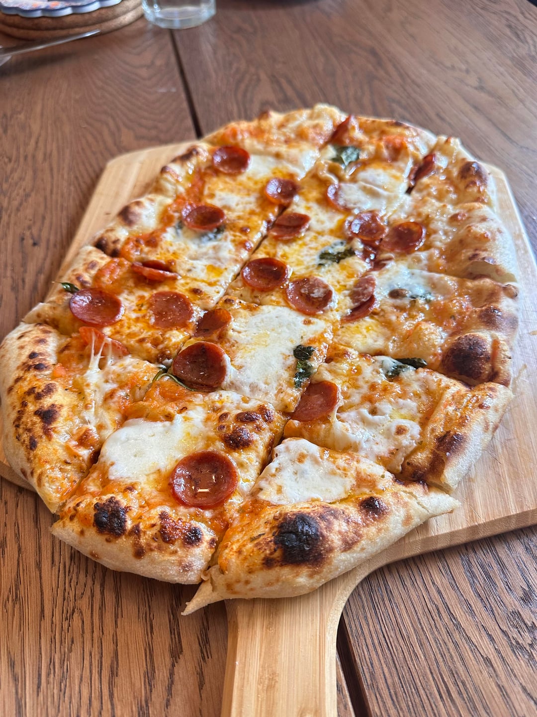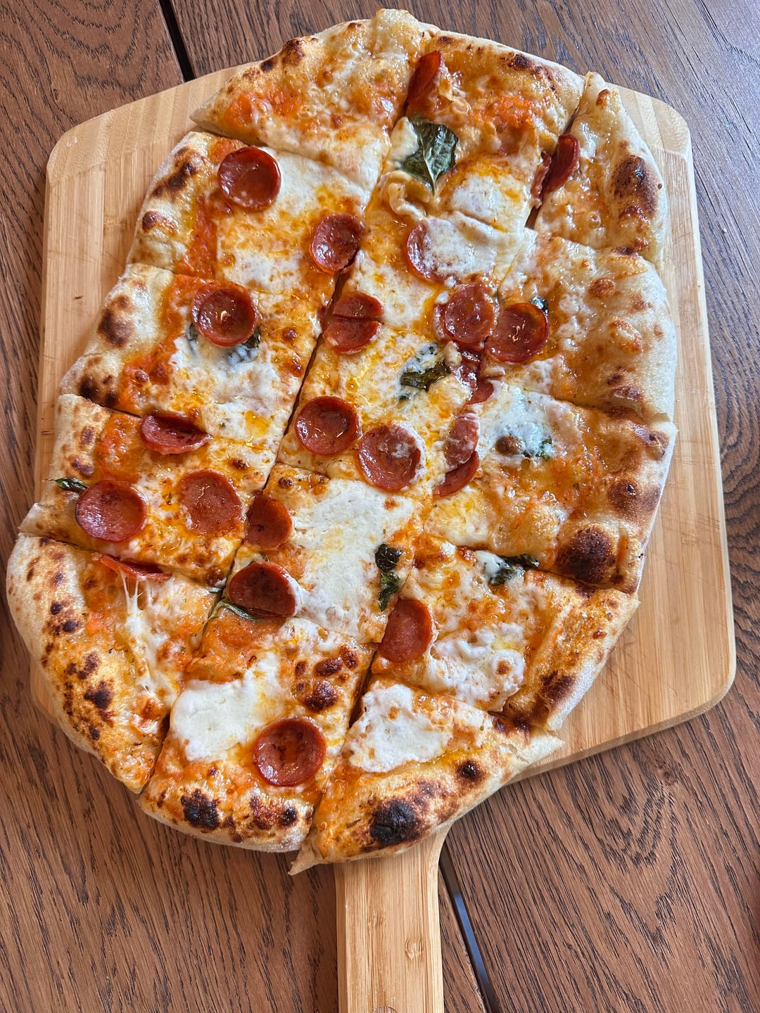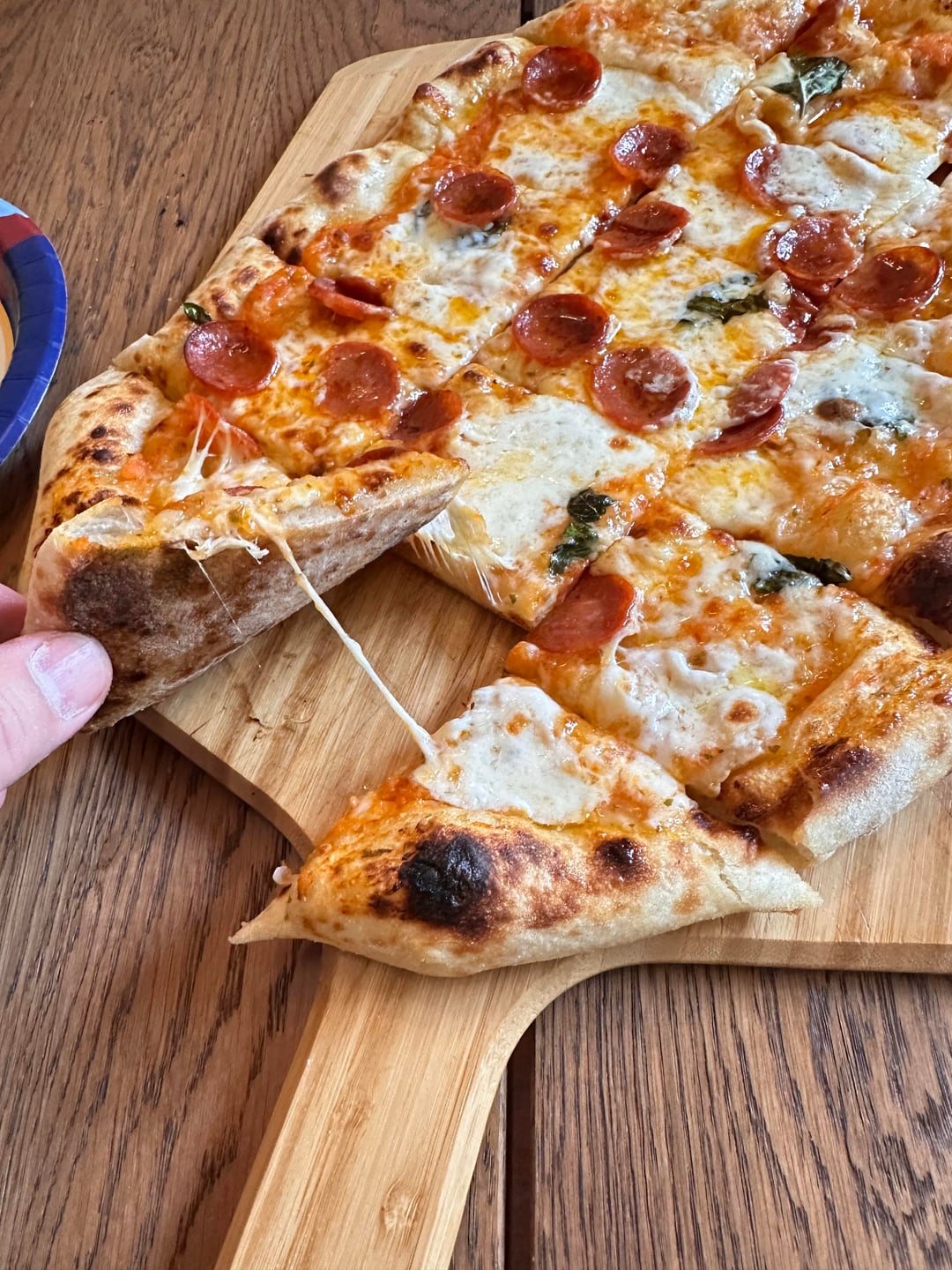 One thing I need to find a solution for is make is less stretchable. As it stretches out with no effort at all. Which can seems like a good thing, but it does make it a bit harder to work with. Second pizza turned more info a flatbread shape when launching. Although, I love the accidental mistake lol Came out great!