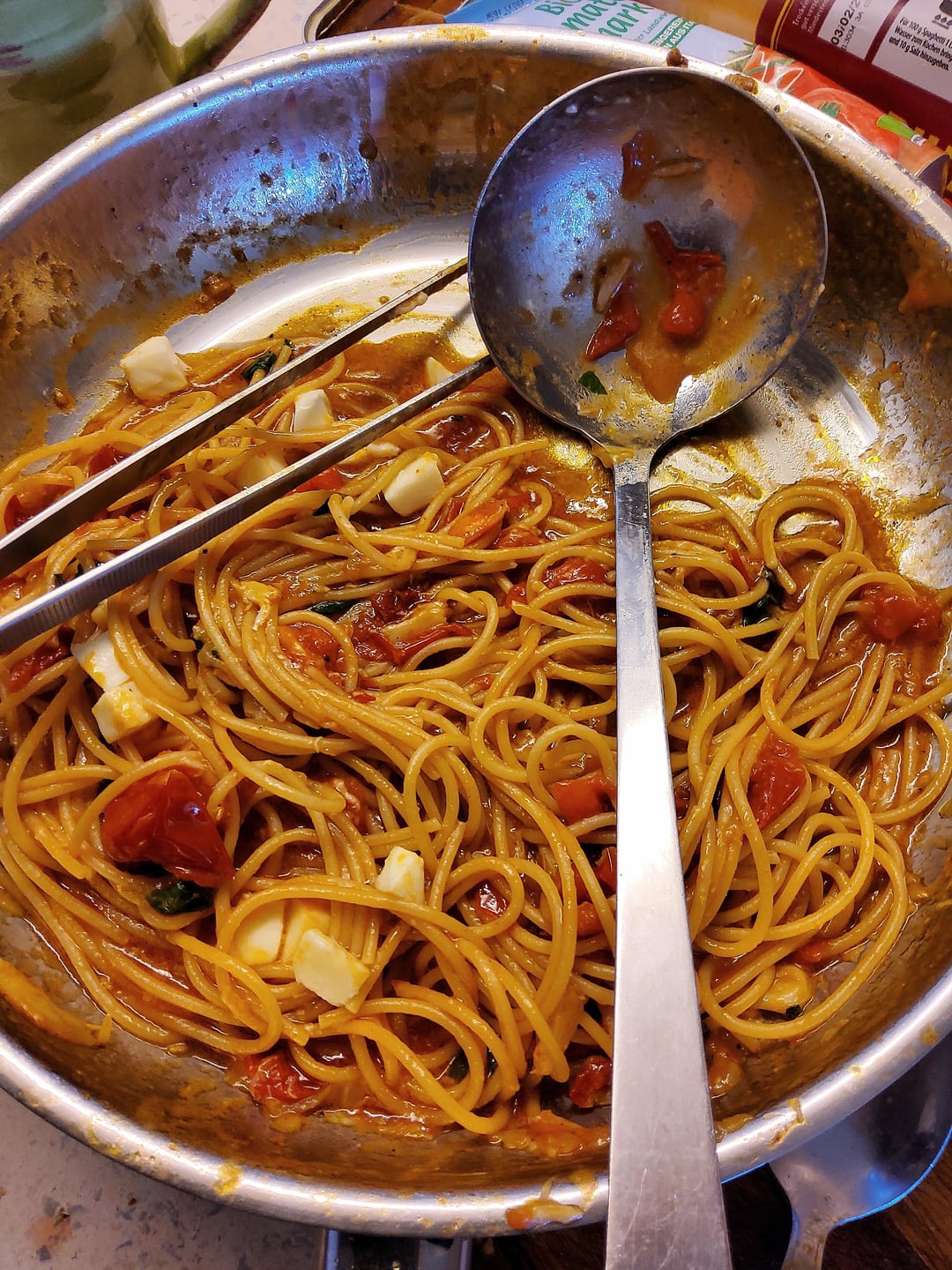 Spaghetti with fresh tomatoes, onion, garlic, salted anchovies, basil, mozzarella, dried chillies, black pepper and olive oil.