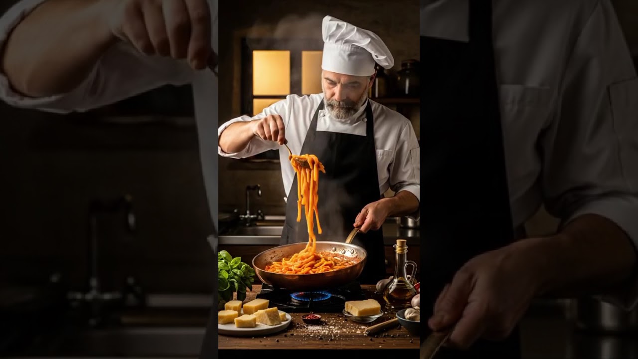 “Experience the art of real Italian cooking! Watch as a passionate chef creates delicious fresh pasta with rich tomato sauce, using authentic ingredients like basil, parmesan, and olive oil. The warm, rustic kitchen and cinematic vibe bring this moment to life.