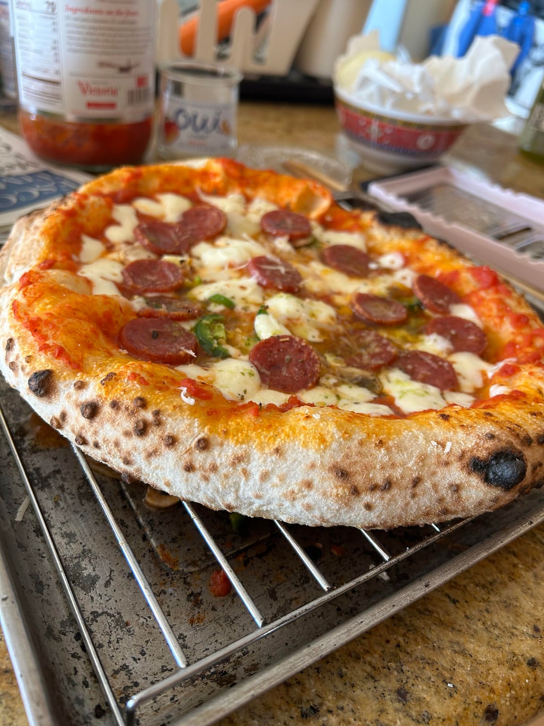 Hi! So this is an attempt at a neopolitan style pizza with my Ooni 16. I am pretty happy with the leoparding and rise on the crust. However, on the third slide (the crust cross section), I was hoping it would be a little bit more airy and not as dense and bread like. Any advice on how to get more air would be greatly appreciated!