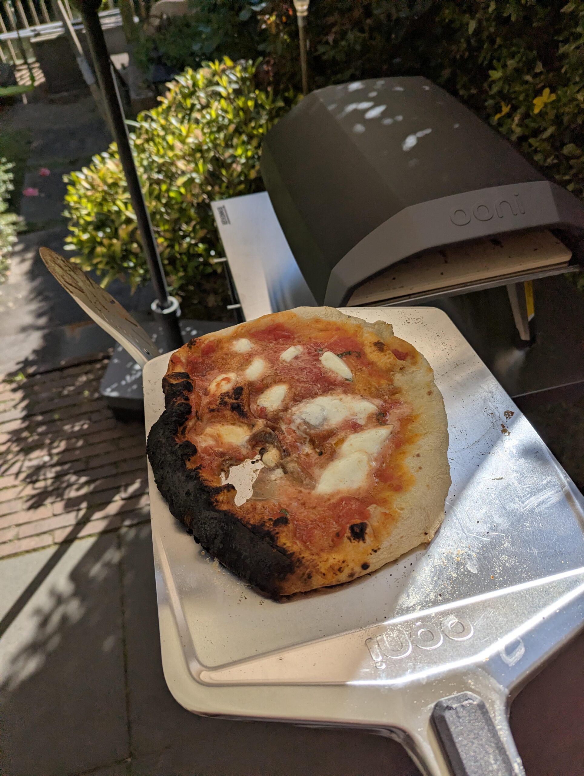 you should use a laser thermometer to check for hotspots and ensure the stone is at 400-500C when you put the pizza in. be much tighter on your timing. Your base is also too thick.