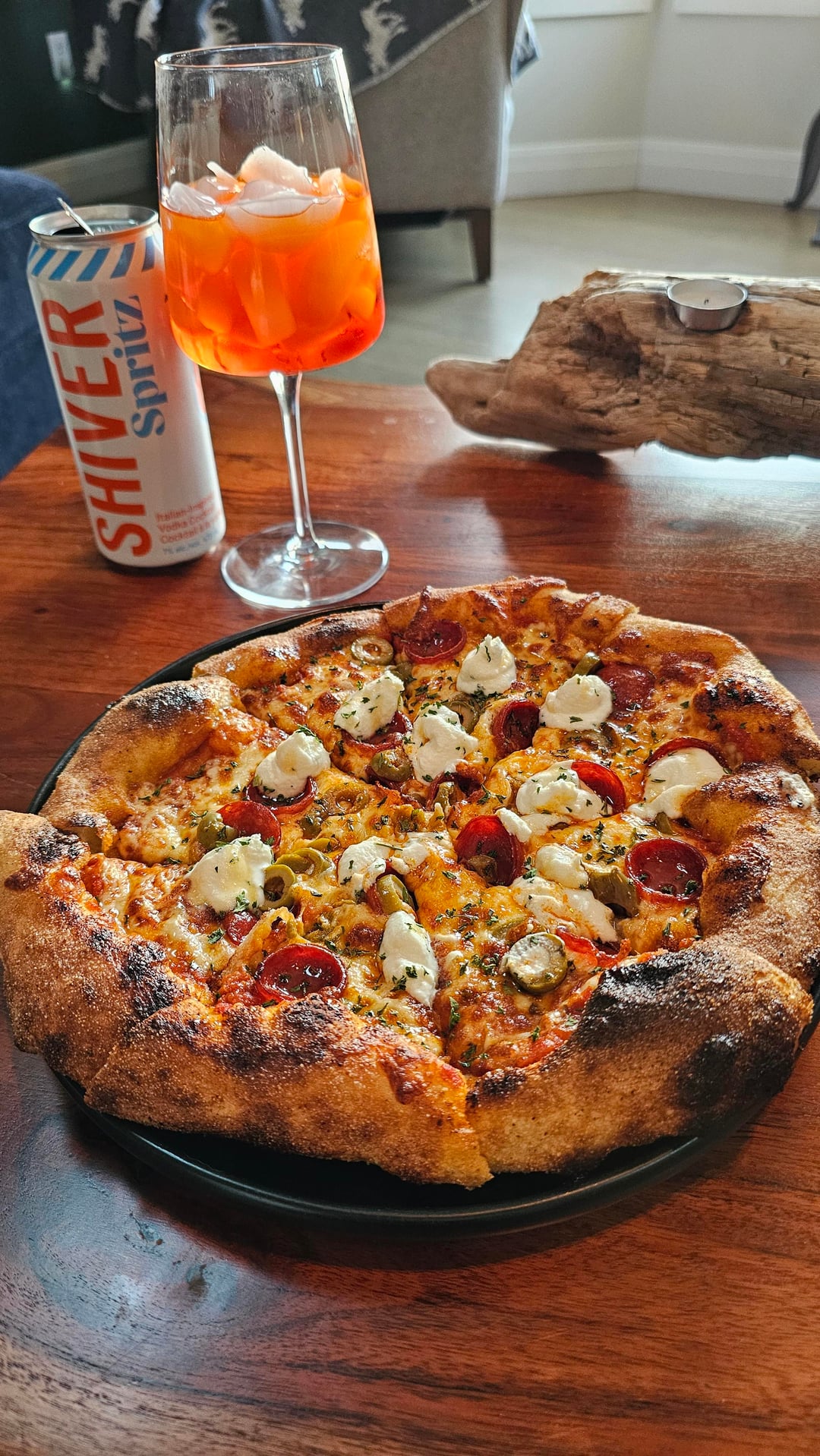 4) pepperoni, olive and hot honey with whipped ricotta