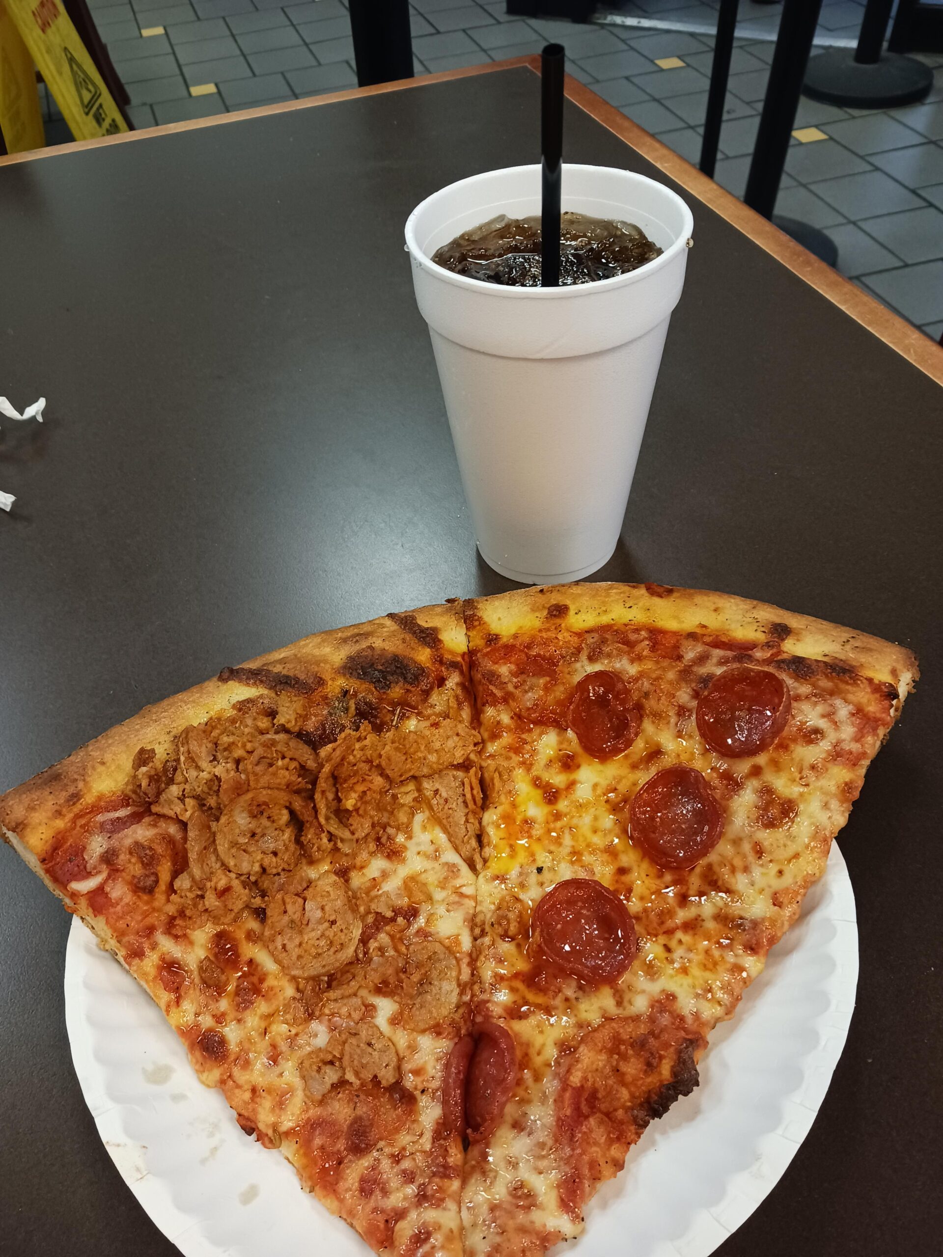 2 slices, 1 sausage, 1 pepperoni, Pepsi. Hot, crispy thin crust, good cheese, good sauce, good toppings. NFL draft Friday lunchtime. $9.83.by Tough_Arm_2454 Looking for FeedbackpizzaWrite A CommentYou must be logged in to post a comment.