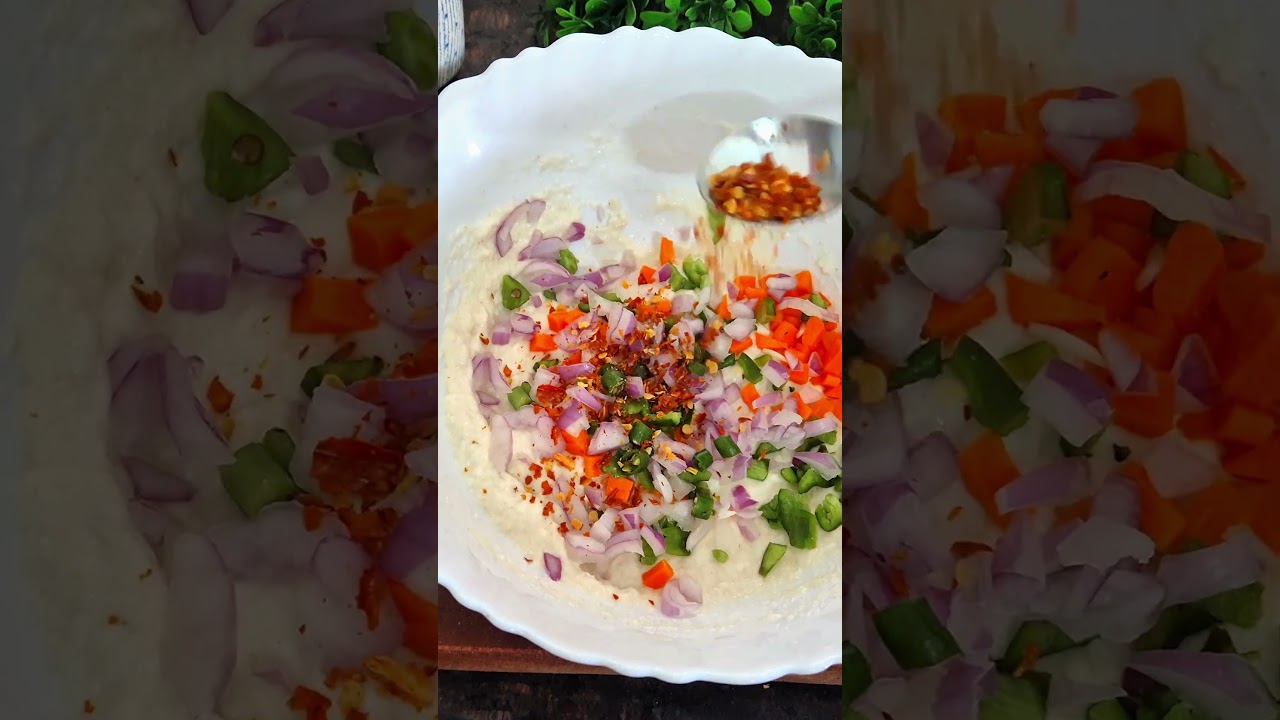 👉 Ingredients: Suji, dahi, sabziyan (pyaz, tamatar, capsicum, corn), pizza sauce, cheese, oregano, chili flakes