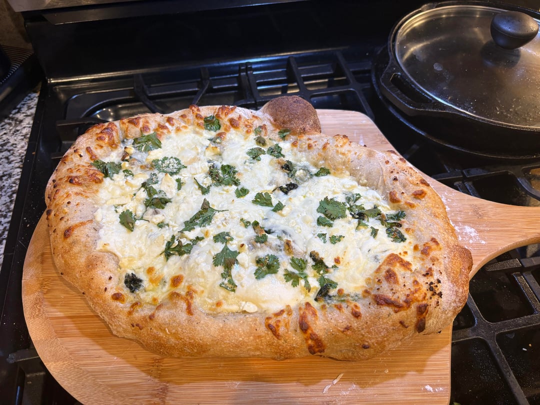 I’ve been making hand tossed pizza for awhile now on my wonderful steel. I took a different turn and made this white pizza with ricotta cheese as the sauce. I used hot honey to top it off. I enjoyed the novelty of the experience but I’m still a big fan of the Italian red sauce.