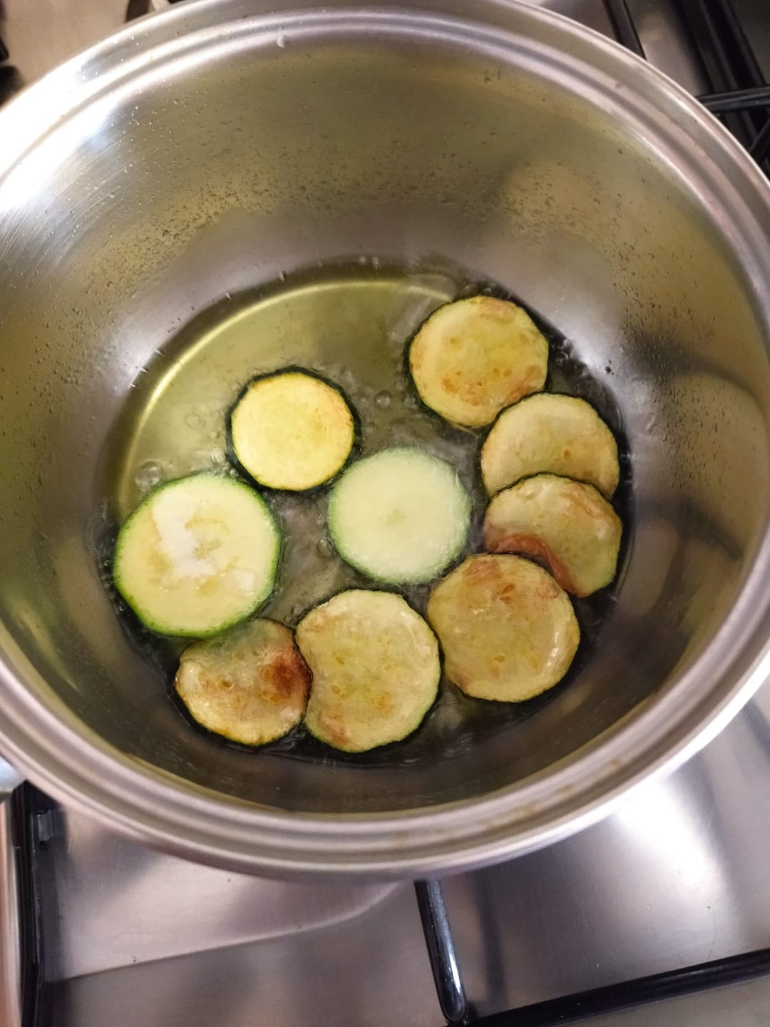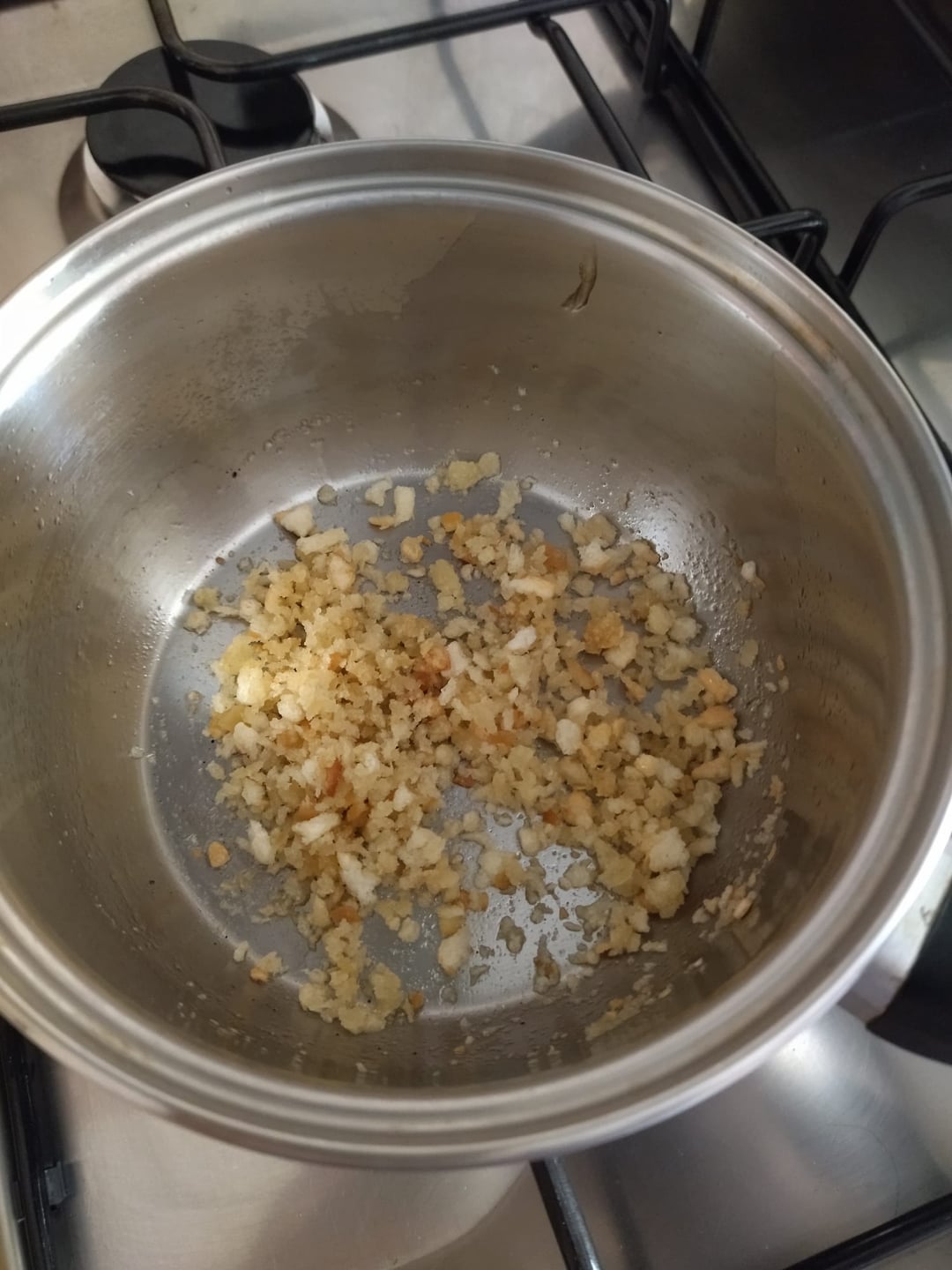 First, I cut a few zucchini rounds and fried them with a clove of garlic. I toasted some breadcrumbs in the remaining oil, and used the rest for the cream.