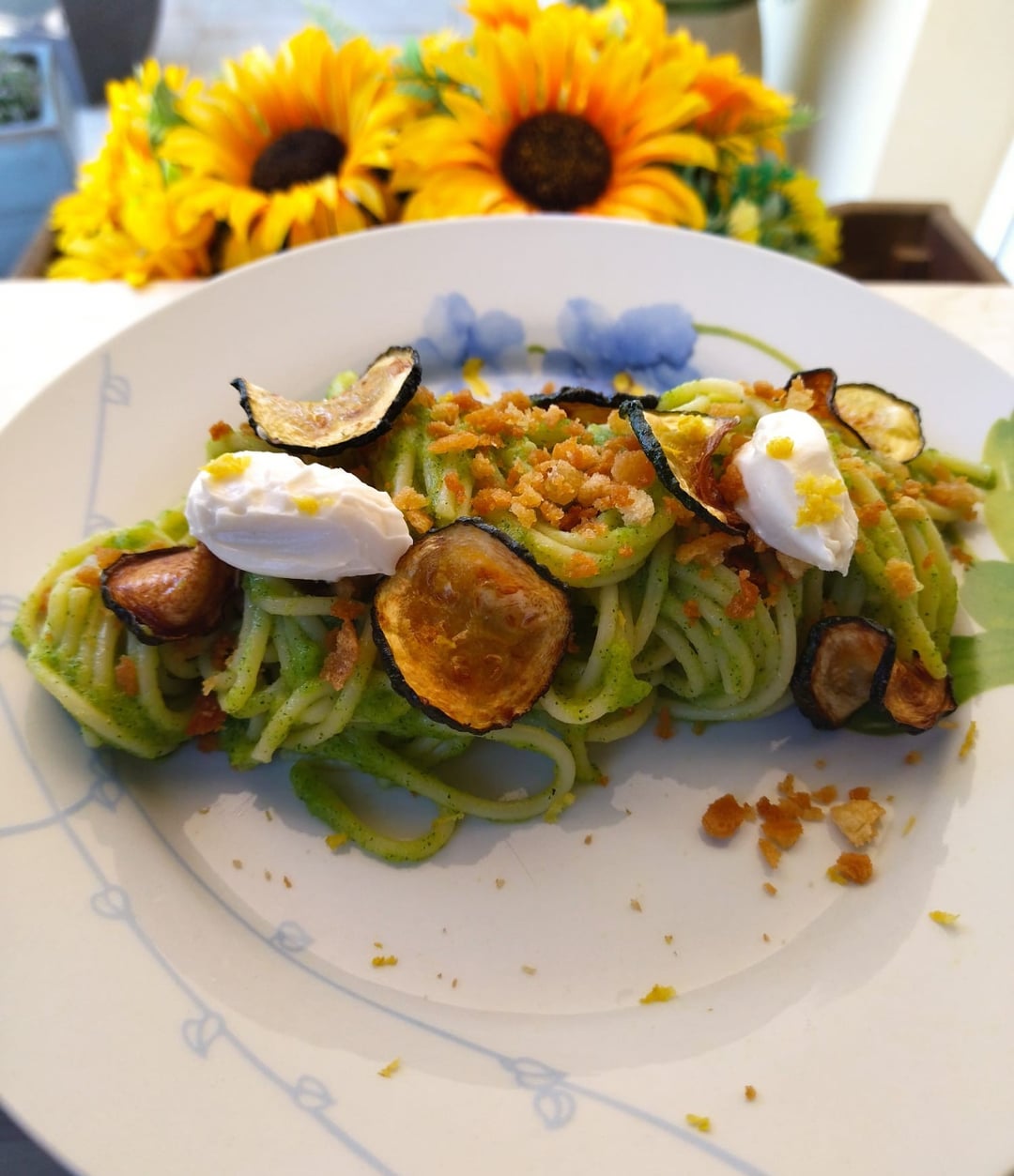Meanwhile, I boiled the pasta in the same water I used to boil the zucchini. Once cooked, I added it to the pan with the zucchini cream. I then plated it and topped it with the fried zucchini rounds, the breadcrumbs, two teaspoons of pecorino cream, and a little grated lemon zest.