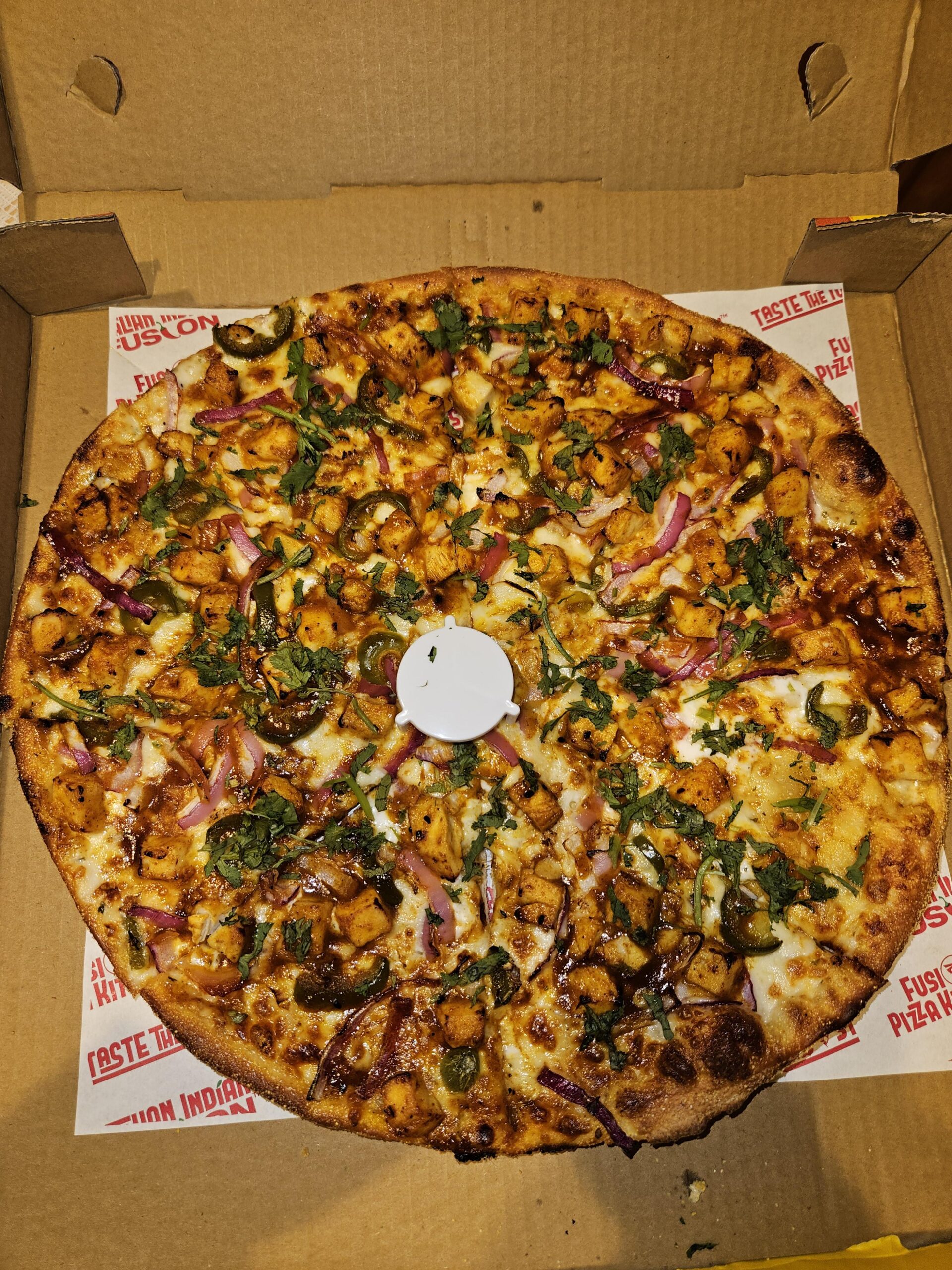 This pizza is made with our signature garlic sauce, fresh diced mozzarella cheese, achari chicken, crisp red onions, spicy jalapeños, garnished with fresh cilantro and green onions for a bold and flavorful twist.by kalakava pizzaTakeawayWrite A CommentYou must be logged in to post a comment.
