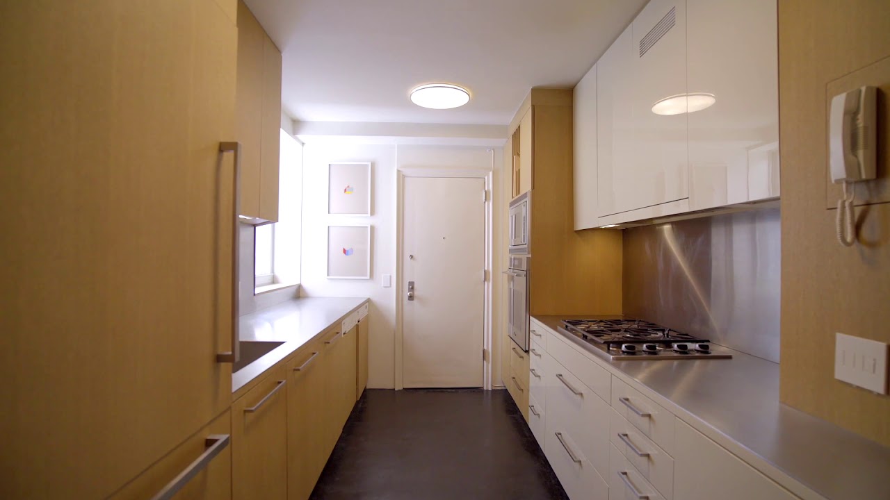 Off a semi private elevator landing is an elegant foyer with a large walk-in coat closet as well as a storage nook with a built-in safe. There is a grand entrance gallery with large walls for displaying art and an elegant powder room. Off the gallery is the magnificent living room which has two oversized windows facing west. This room has a ventless fireplace that was originally wood burning. Adjacent is a corner dining room that faces west and north as well as a library or third bedroom. There is a windowed eat-in kitchen that faces east and has a large breakfast area and excellent storage space. The kitchen is finished with stainless countertops and backsplashes, custom oak and lacquered cabinetry, and cement floors. It is equipped with top-of-the-line appliances including a Subzero refrigerator/freezer, a Dacor range and oven, a Dacor microwave, and a Miele dishwasher. There is also a laundry area with a Miele washer and dryer.