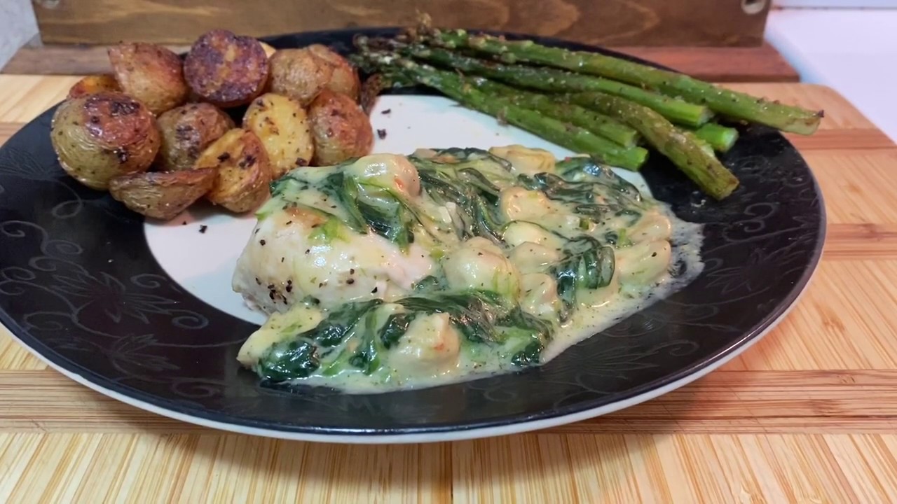 Recipe for chicken in white wine cream sauce with spinach and mushrooms:
