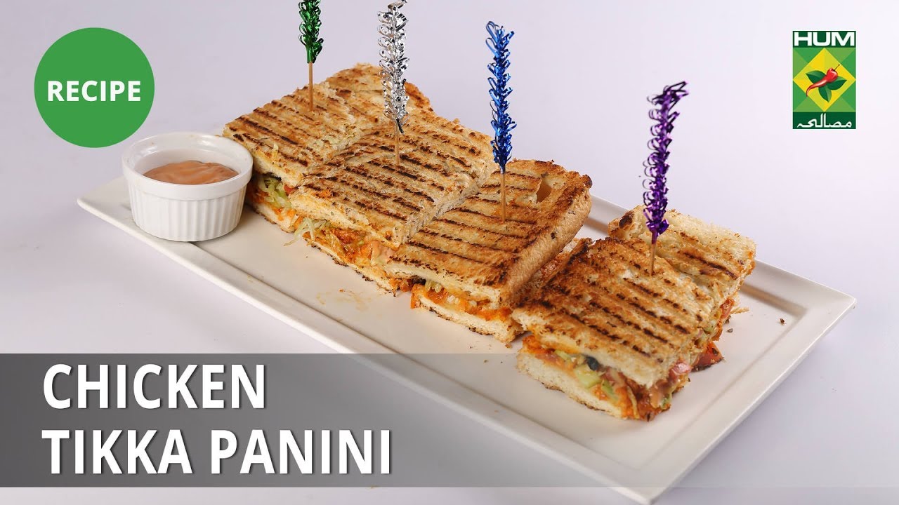 Marinate chicken with given ingredients, pan fry in 2 tbsp oil until done, give dum of coal, mix together all the ingredients for sauce, apply on panini bread, toss together tomatoes, cucumber and lettuce, place the vegetables on bread, drizzle with some sauce, put chicken tikka pcs, cover with cheese slices, top with panini bread, grill in the oven till cheese melts or cut in slices and serve without drilling.