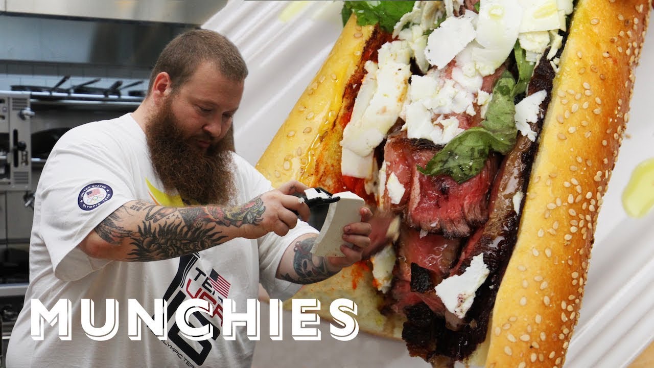 Action Bronson stopped by the MUNCHIES Test Kitchen to show us how to make his version of a simple butcher’s sandwich. While a regular butcher’s sandwich usually consist of some meat on bread with very little garnish, this version is as over-the-top as the man showing you how to make it. First, we start with some good Italian bread, a juicy rib-eye, and some olive oil. The second realm of this beast consists of ricotta salata and Calabrian chiles, and as if that weren’t enough, a smear of grape must from the 1989 vintage of Paolo Bea Winery’s top red wine. Enjoy!