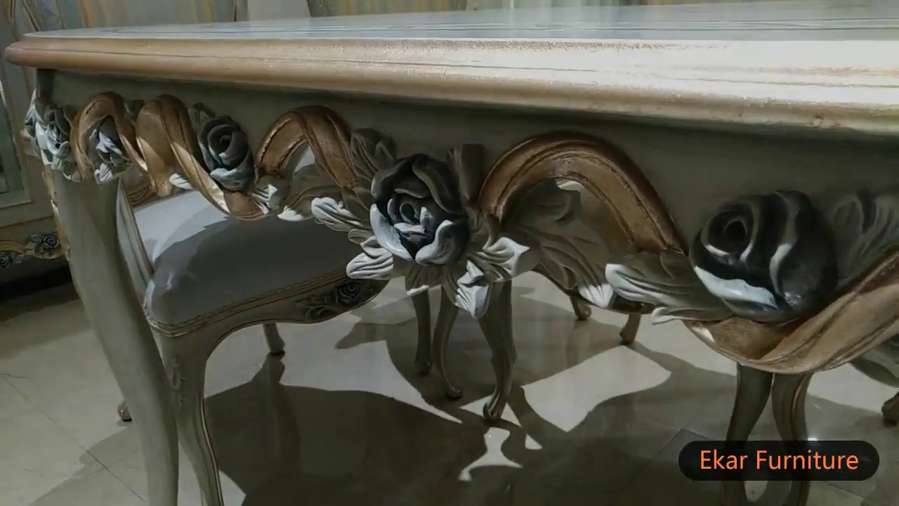 The Luxurious Designer Rectangle Italian 8 seat Dining Table Set with beautiful rose and ribbon detail is shown here in an antique finish with beautifully hand painted bleached silver detailing to the entwined ribbon detail and wooden top. Height 78.5 cm x width 220 cm x depth 100 cm , for matching chair or more designs welcome to visit our website !