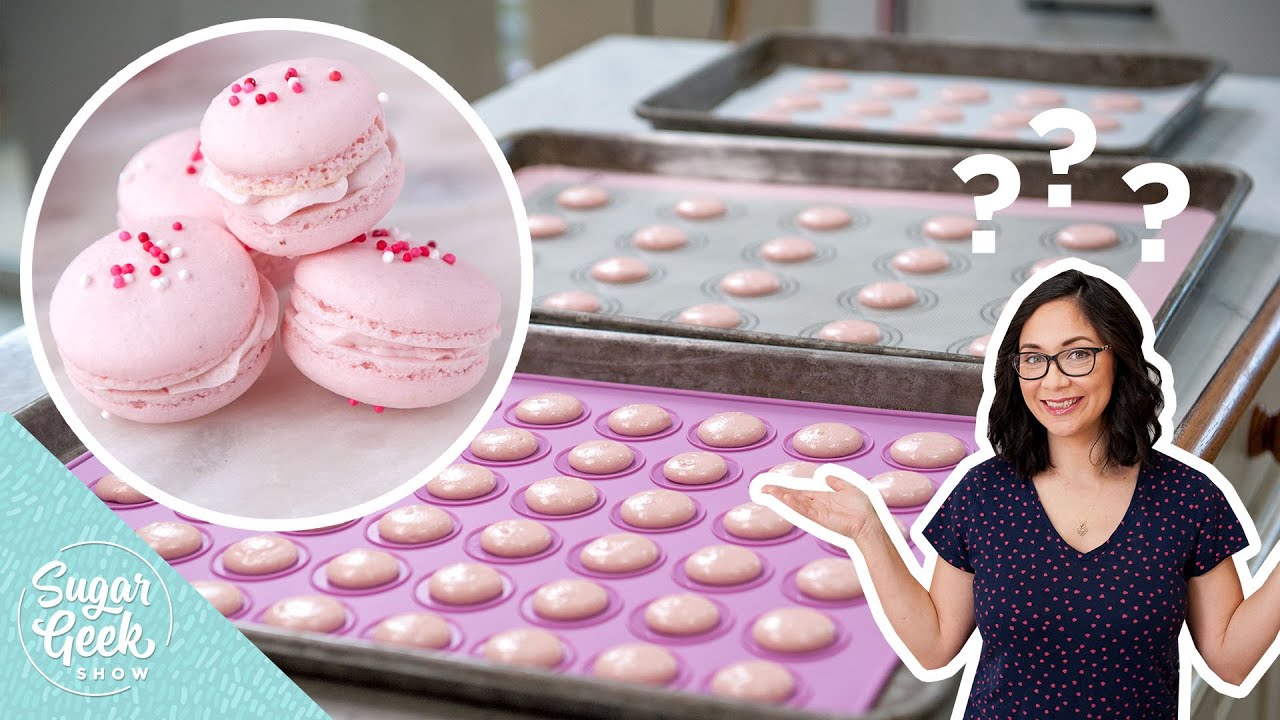 We’re making delicious strawberry macarons today and doing a test to see what makes the best strawberry macarons. Silicone mat, parchment paper or ridged macaron mat!