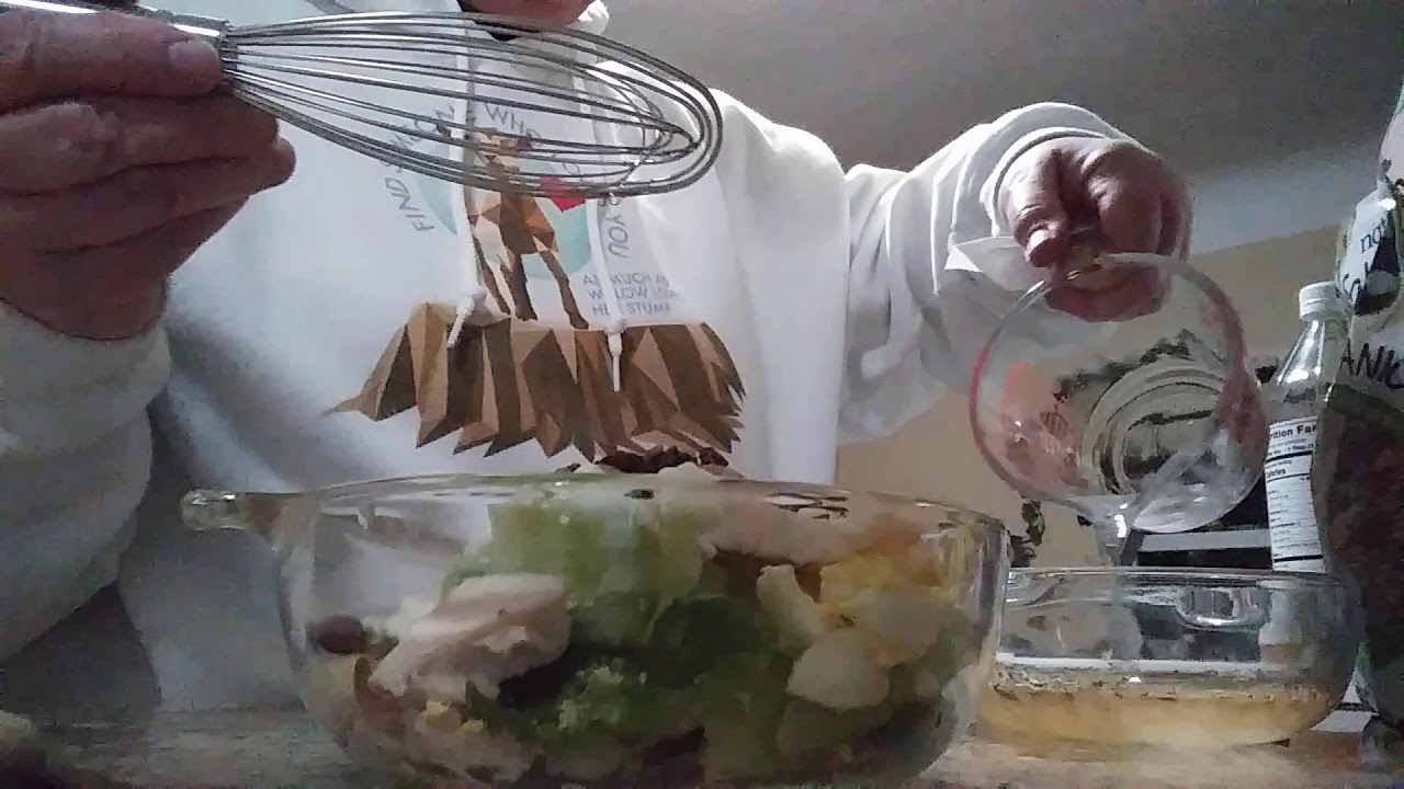 Salad has chicken, diced hard boild egg, romaine organic lettuce, crumbly blue cheese , home made Italian dressing with 1 tbs Italian herbs , 1/2 Cup organic apple cider vinegar, 1/4 cup or 50 ml of melted coconut oil ( organic) pour on salad and totally enjoy the benefits of apple cider vinegar and coconut oil.