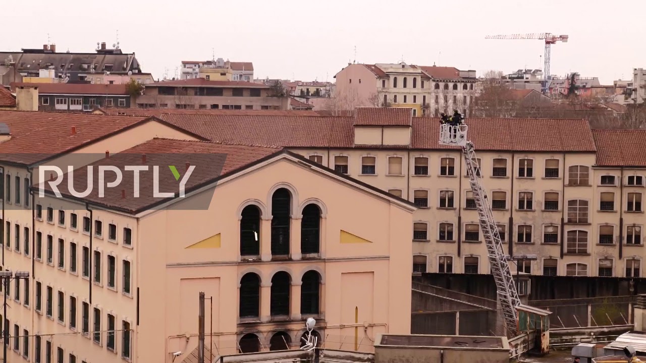 Inmates in San Vittore prison in central Milan continued their protest over the measures to contain the coronavirus, on Monday. Footage shows a dozen of people on the jail’s rooftop as they hold a painted sheet with the word “Induito ” (“Pardon” in Italian). Smoke can also be seen billowing from the building, where cells were reportedly set on fire.