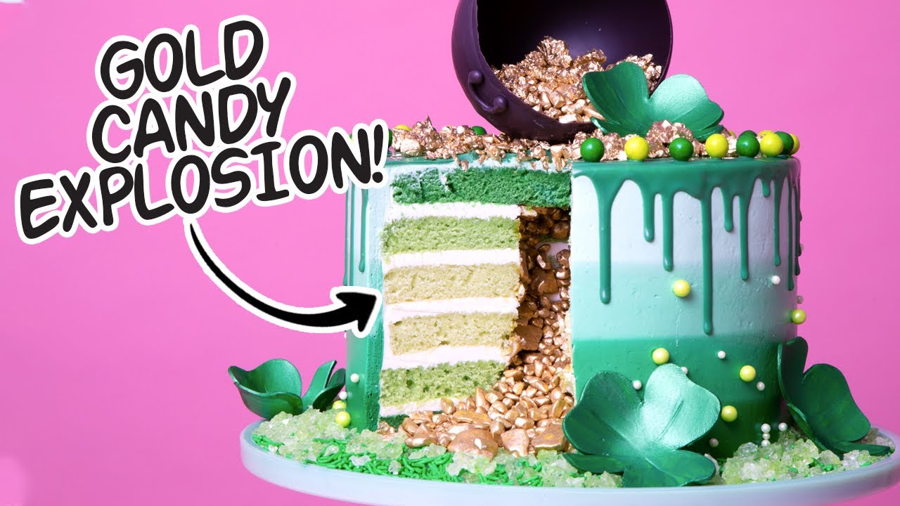This St Patrick’s Day, Yolanda Gampp of How To Cake It shows how to make green cake in ombre color pattern. Dyed vanilla cake is stacked with Italian meringue buttercream, with a surprise chamber cut inside filled with gold candy. It’s topped with shamrocks, luster dust, rock candy, and candy melts.