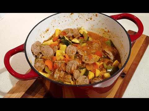 9. Cut the sausage into diagonal slices and add to the pan and cook about 10-15 minutes more – longer if you like, until sausage is cooked through and stew is flavourful.