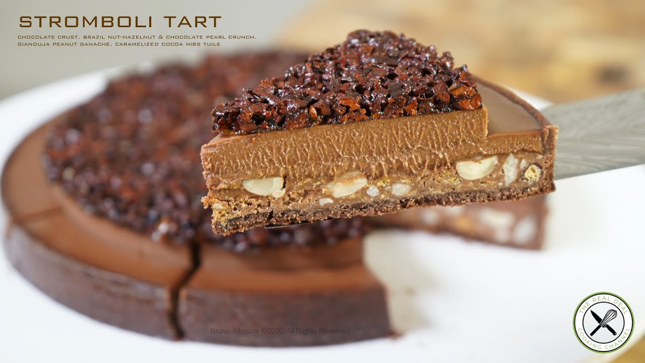 The Stromboli tart is a remarkable combination of texture mingling chocolate, nuts and cocoa nibs (crushed cocoa beans) mimicking the magma and lava crust of the Stromboli volcano in Italy. A recipe inspired by François Daubinet head chef at Fauchon pâtisserie in Paris. Enjoy!