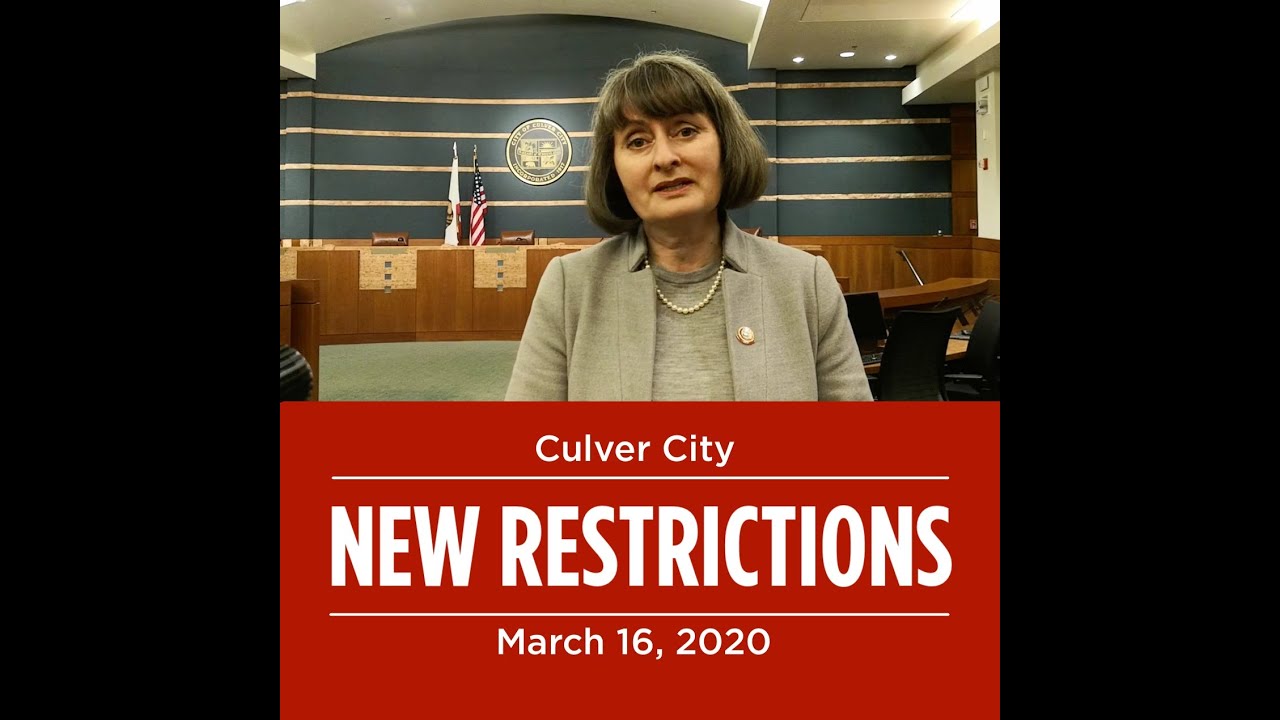 I’m Culver City Mayor Meghan Sahli-Wells with an important update on new mandatory closures and restrictions that will protect our community from the spread of the Coronavirus or COVID-19.
