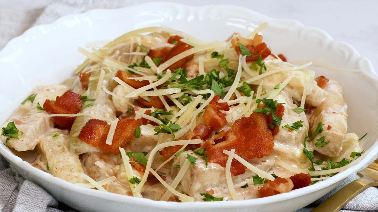 Eggplant noodles soak up all of the bacon fat then is coated with a quick Alfredo sauce and tossed with crispy bacon. Eggplant and Bacon Alfredo is a hearty dinner that everyone will love.