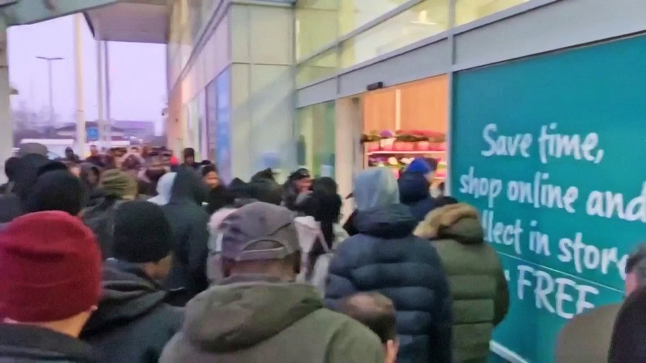 Scuffles break out as crowds try to enter supermarket in Wembley, northwest London.