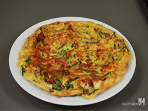 Today I’ll show you the Calabrian asparagus omelette, a farmer’s recipe which is typically prepared on Easter Monday. We will need: 350 grams of fresh wild asparagus, 6 eggs, 6 spoonfuls of water, 50 grams of flour, 80 grams of Calabrian pecorino cheese, 120 grams of Calabrian brawn (soppressata), salt and extravirgin olive oil. To start, we put to warm up a pot of water, which we will use to parboil the asparagus. We cut the vegetables in small pieces, removing the tough parts. At this point, we dip them in the boiling and slightly salted water, we let them cook fro 3 or 4 minutes, then we drain them. In the meantime, we cut both the brawn and the cheese in small cubes. Now our ingredients are ready and we can prepare the mixture for the omelette. We put in a glass bowl the flour, we add the water and we blend them. Once the mixture is smooth, without lumps, we add the eggs, then we mix well everything. We add the brawn, the cheese, the asparagus, some salt, and mix. At this point, we warm up 4 or 5 spoonfuls of oil in a pan; once it is hot, we pour the omelette mixture in the pan, /blending it so that the egg can coagulate easily and in a uniform way. /we flatten the omelette and we let it cook for 3 or 4 minutes at low heat. Once the omelette has got a golden colour, we can do the twist. If it is small, we can twist it inside the pan itself; otherwise, we can use a dish and transfer it again in the pan.