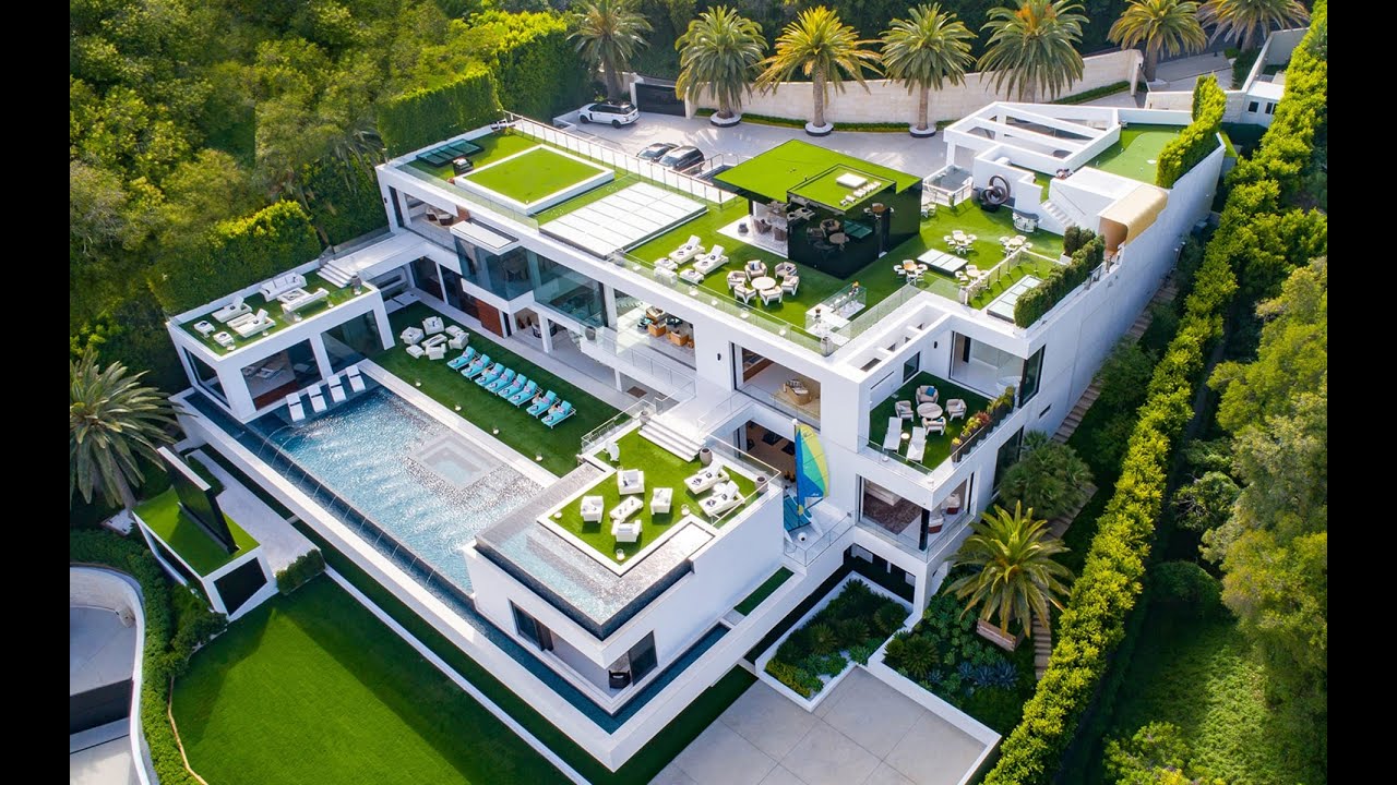 The house at 924 Bel Air Road consists of 38,000 square feet (3,500 m2) of living space on four levels. It features 12 bedrooms: two master suites and 10 VIP oversized guest suites. The interior contains 21 bathrooms adorned with 50 types of marble imported from Italy, five bars, three gourmet kitchens, three dining areas, a state-of-the-art fitness center, a wellness spa, a 4-lane bowling alley, a $12,000 glass pool table, and a 360-inch TV, likely the largest residential television set. The $2 million, 40-seat Dolby Atmos James Bond-themed theater features a 22-foot screen, 57 speakers, and a 4k projector with 7,000 pre-loaded movies. Situated on a 1.08-acre lot, the exterior of the home features 17,000 square feet (1,600 m2) of outdoor deck space, a $2 million outdoor hydraulic retractable theater screen measuring 18 feet by 12 feet, an 85-foot glass tile infinity pool with a swim-up bar, and a helipad with an inoperable Airwolf replica that the developer calls a “sculpture.”The home offers a 270-degree unobstructed view of Los Angeles from the San Gabriel Mountains to the Pacific Ocean in Malibu.