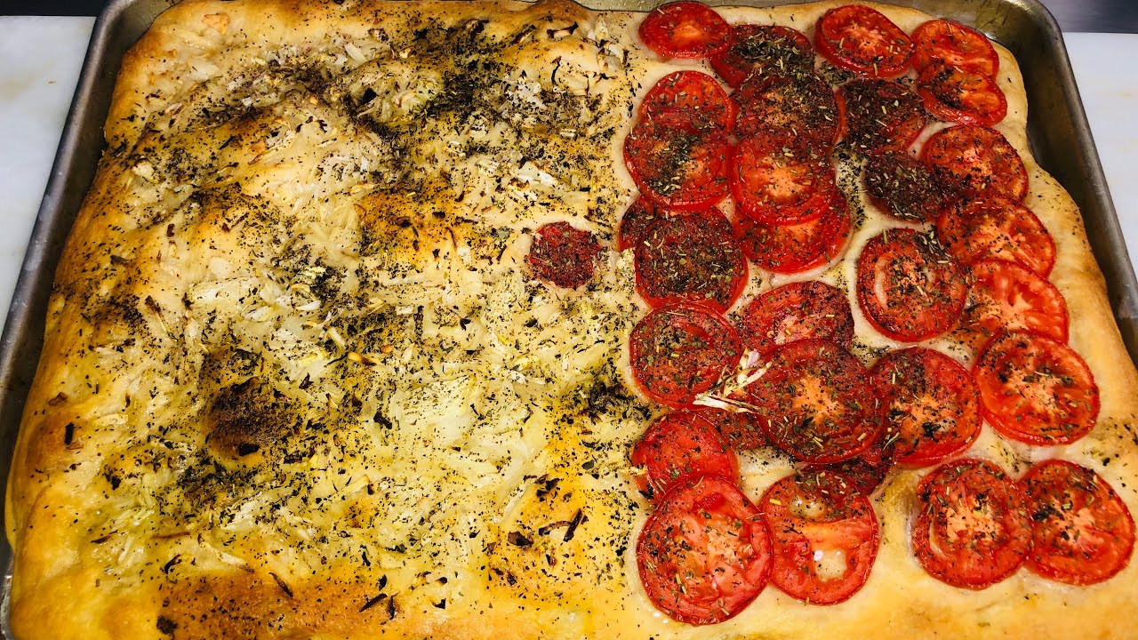 After an hour oil the baking pan flip the dough in the middle and stretch the dough gently to the pan size let the dough rest for about 30 minutes for it to rise.