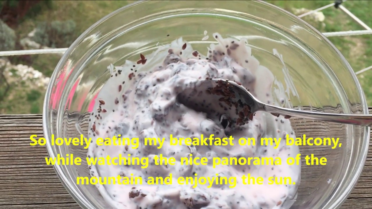 28th of March, my breakfast yogurt with raisins, flax seeds and Chia seeds. Eating my breakfast on my balcony, while watching the nice panorama of the mountain and enjoying the sunny morning.