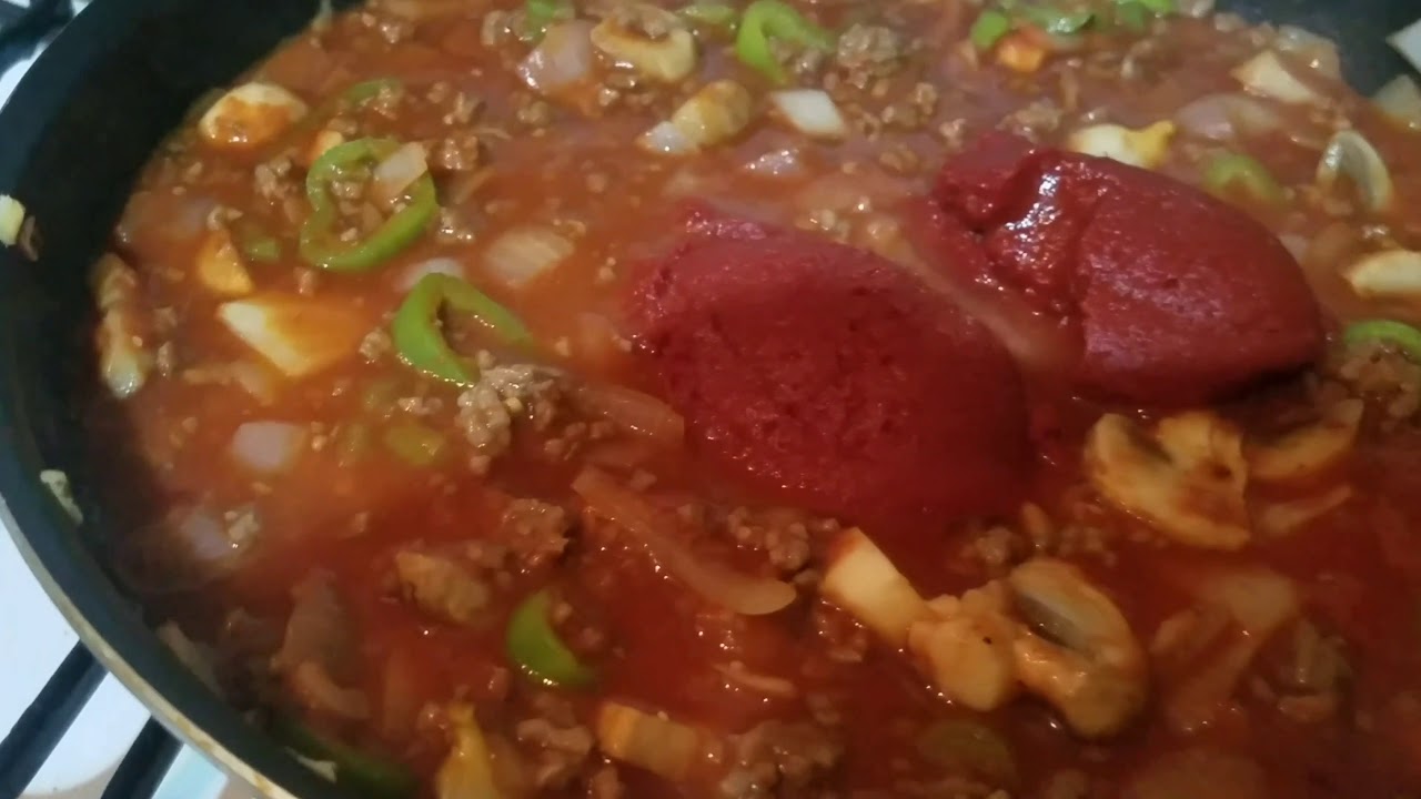 1 pound ground beef. Salt, pepper, oregano, hot pepper, 1-2 tbsp. sugar. Season to taste. Chop 2 large onions. 3 medium peppers. 10 large mushrooms. Mince 5 cloves garlic. Fry together with olive oil. Add about 2.5 cups tomato paste, add 2 cups boiling water. Simmer 1 hour . 1 Package of cooked spaghetti. Wahala! Serve with Parmasan, mozzarella or kaşar