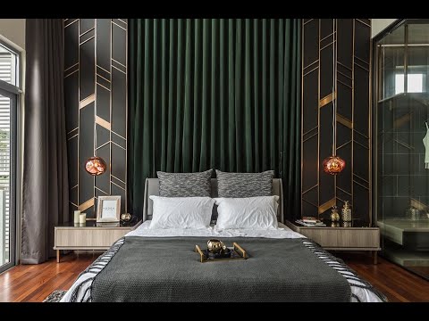 The dark green curtains with gold-line panels on both sides create a strong feature for the bed in the Master Bedroom. The space seamlessly flows into the walk-in wardrobe and vanity area where only glass walls and sliding doors are used to segregate the two spaces. For the secondary rooms, artistic approach by dressing the walls in glamorous textured finishing and abstract artwork infuses the rooms with distinctive personalities.