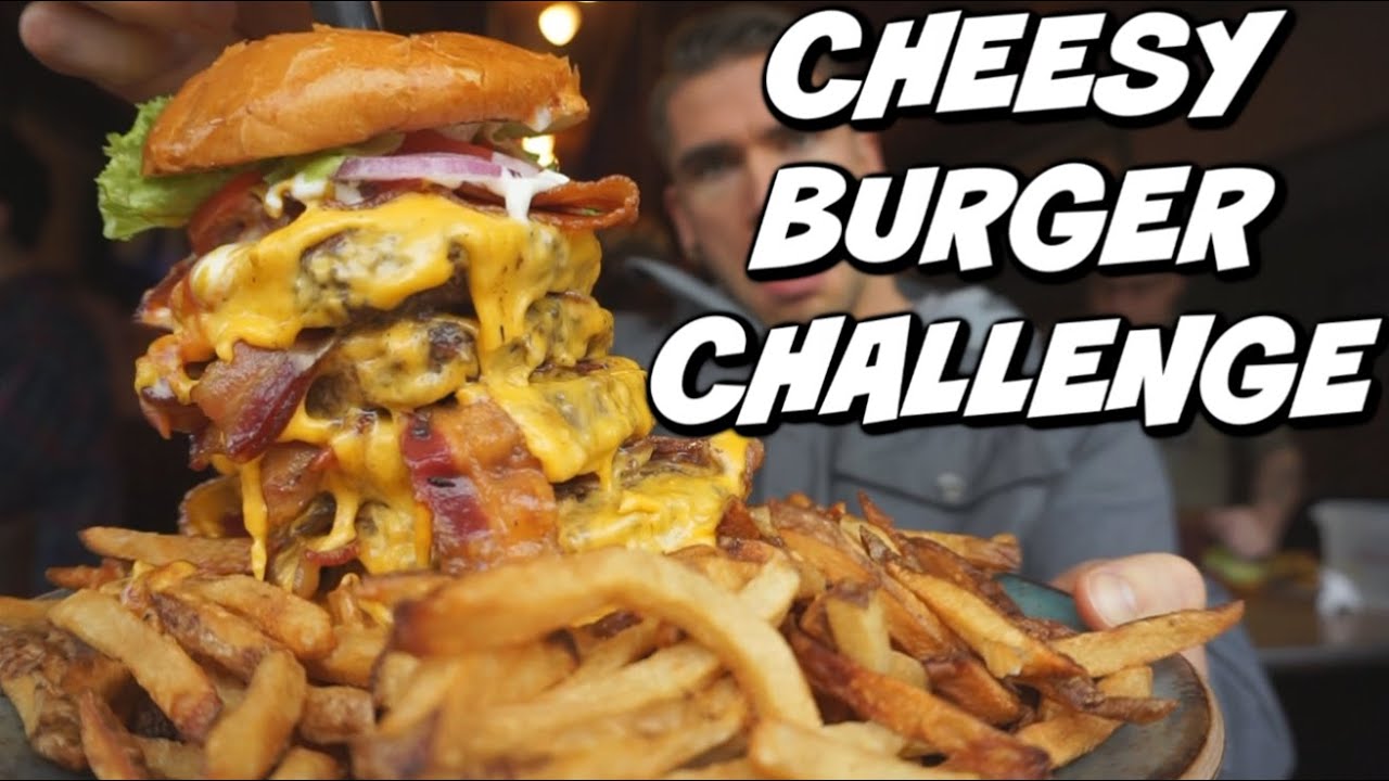 A well done cheesy cheese burger challenge with lots of bacon! I am a big burger fan, and rarely deny the opportunity to eat some good burgers. So, we are at sidelines taking on their big burger challenge~! #ManVsFood #Burgerchallenge #Foodchallenge