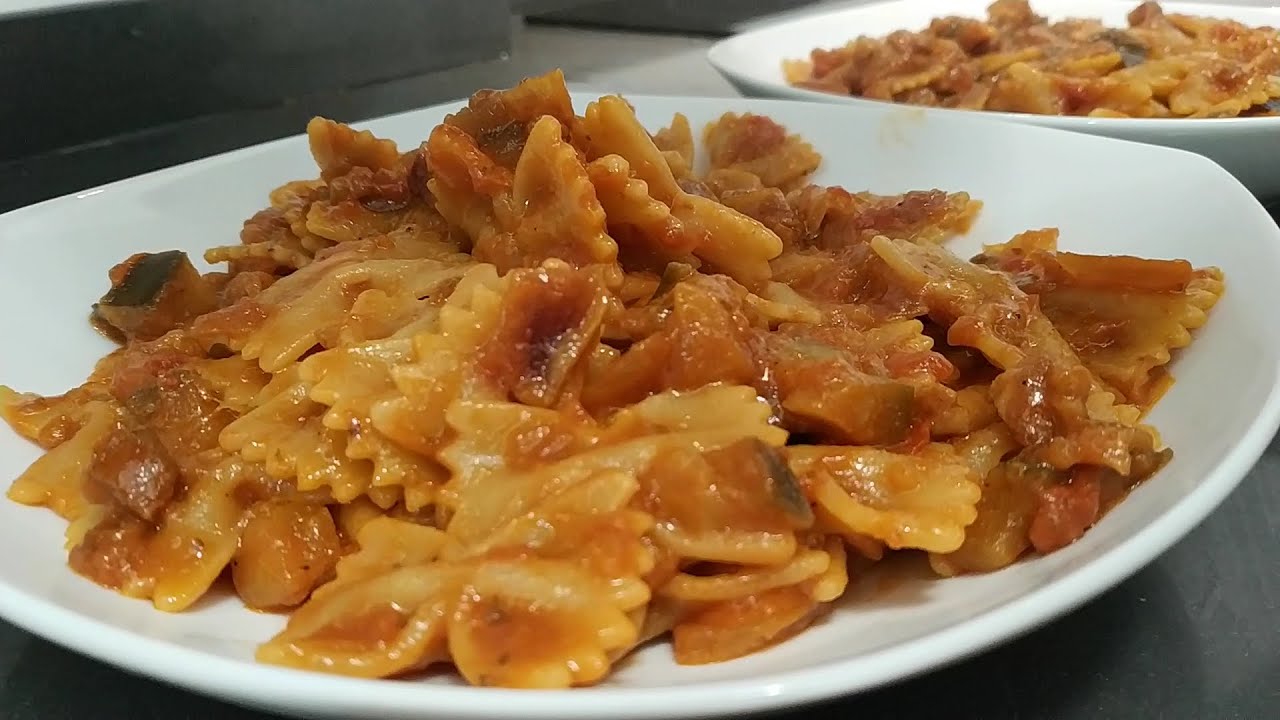 Farfalle are one of the most important Italian traditional pasta. In English language they can also be referred as bow-tie or butterfly pasta. Enjoy it with stir-fried eggplant and bacon.