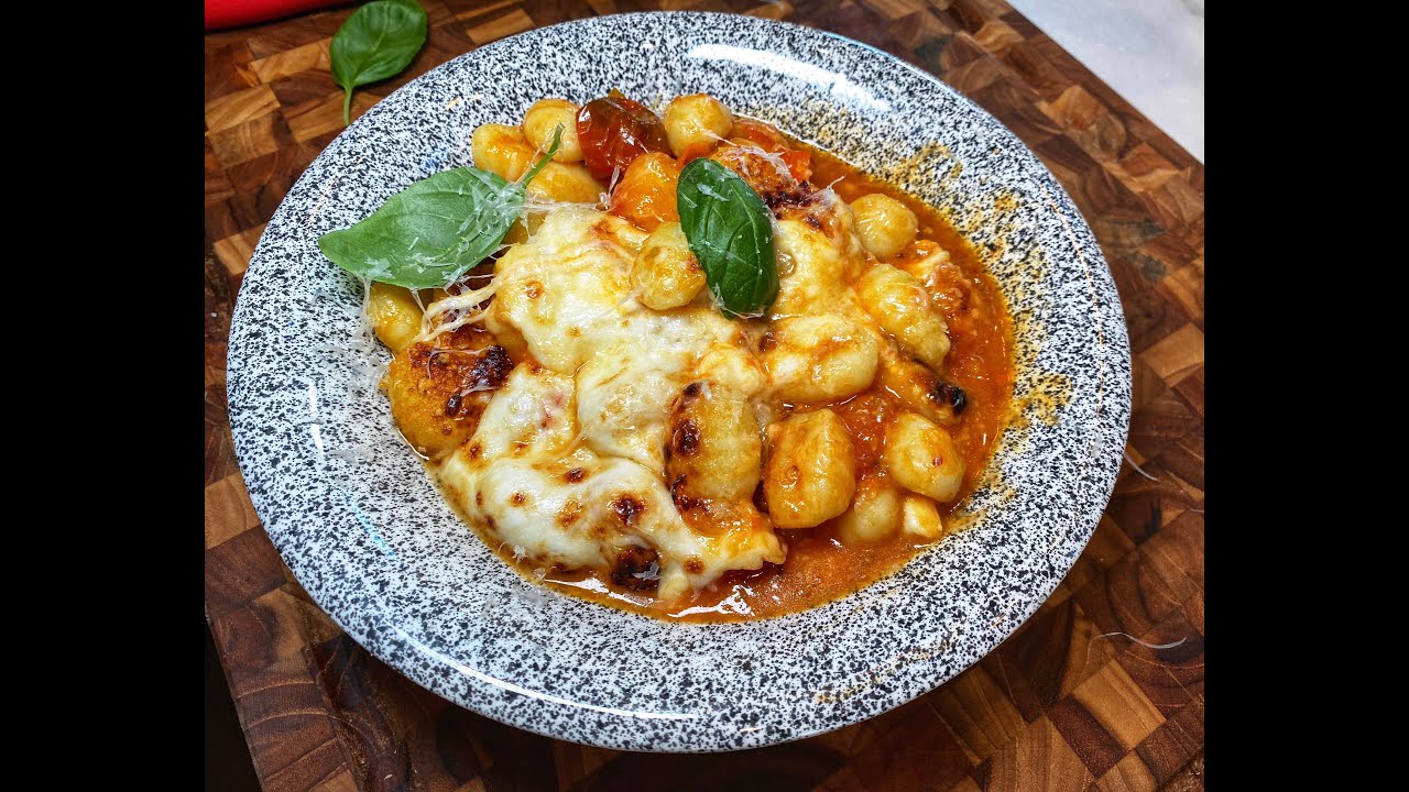 line a baking dish with a splash of sauce and some olive oil. cook gnocchi untill they float and then skim them into the sauce. place mixture into baking dish. add 1/3 of mozzarella as cubed in the mixture, the rest slice and cover the surface. add a generous dusting of parmigiano.