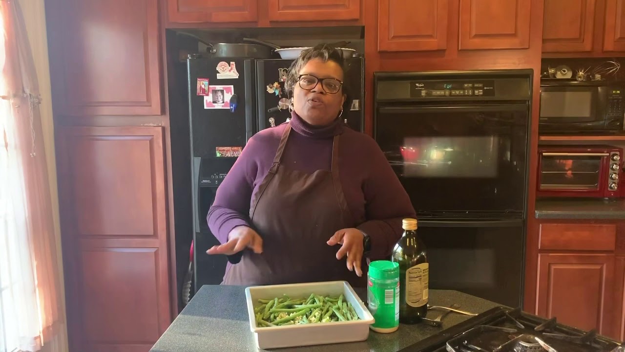 Preheat oven to 400 F degrees. In large mixing combine all ingredients and stir until well combined. Add all ingredients to a shallow baking pan in a single layer. Cook for 30 minutes stirring occasionally until tender. Remove from oven, set aside for 5 minutes and serve. Note that if you use French Green Beans, reduce the cooking time to 20 minutes.