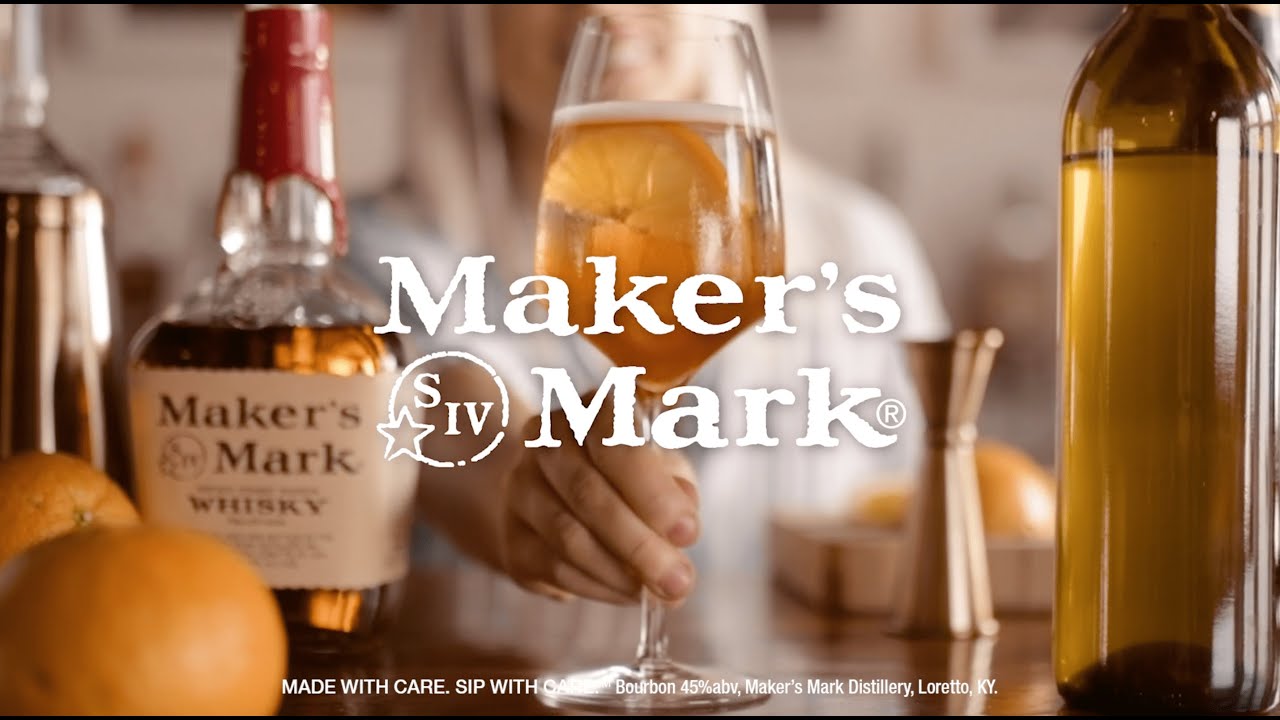 1. Fill a wine glass with ice and layer in Maker’s Mark®, Aperol and syrup.